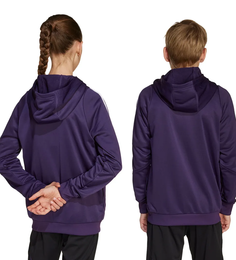 Elegant adidas Performance hættetrøje i en dyb, lilla nuance med hvide striber langs ærmerne, og med et delikat Manchester United-logo på brystet.