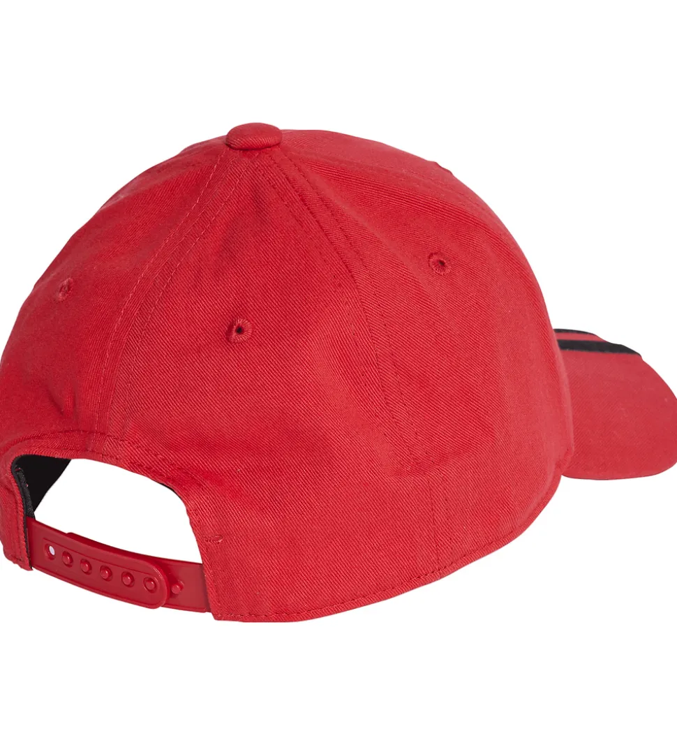Flot adidas Performance kasket i en klar, rød farve med et Manchester United-logo på fronten. Kasketten har tre, sorte striber på skyggen, der tilføjer en dynamisk detalje til designet.