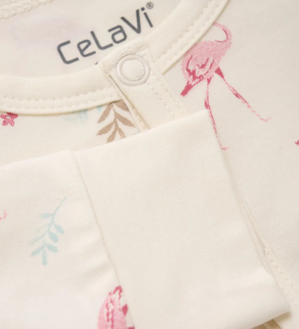 CeLaVi heldragten har lange ærmer og lange ben med brede ribkanter med ombuk, der kan pakke barnets hænder og fødder godt ind. Heldragten åbnes med gennemgående trykknapper fra halsen til venstre fod, og den har smalle ribkanter i hals- og kropsåbningen.