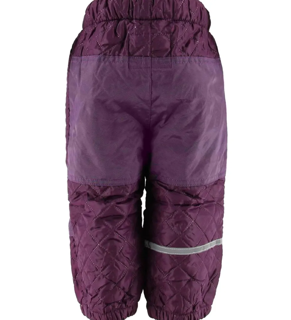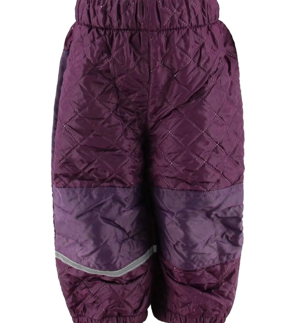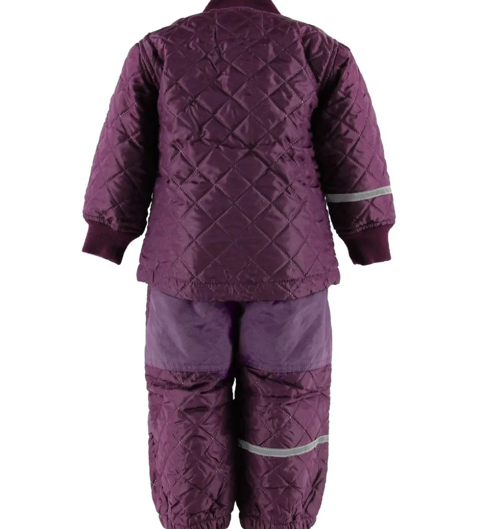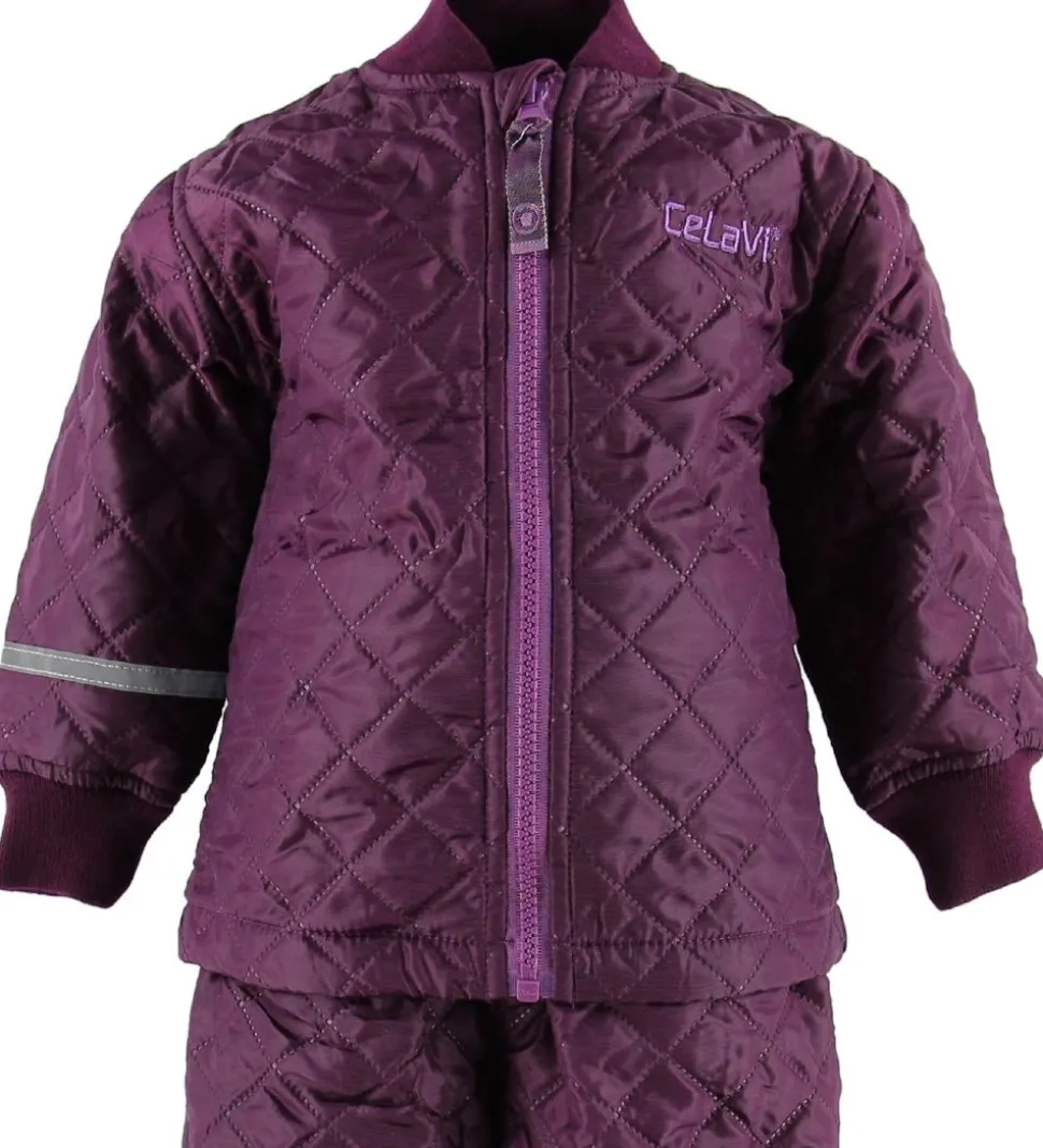 Skønt CeLaVi termotøj bestående af en jakke og et par bukser i mørkelilla med quiltet struktur. Omkring højre arm samt venstre ben er der en praktisk refleks.