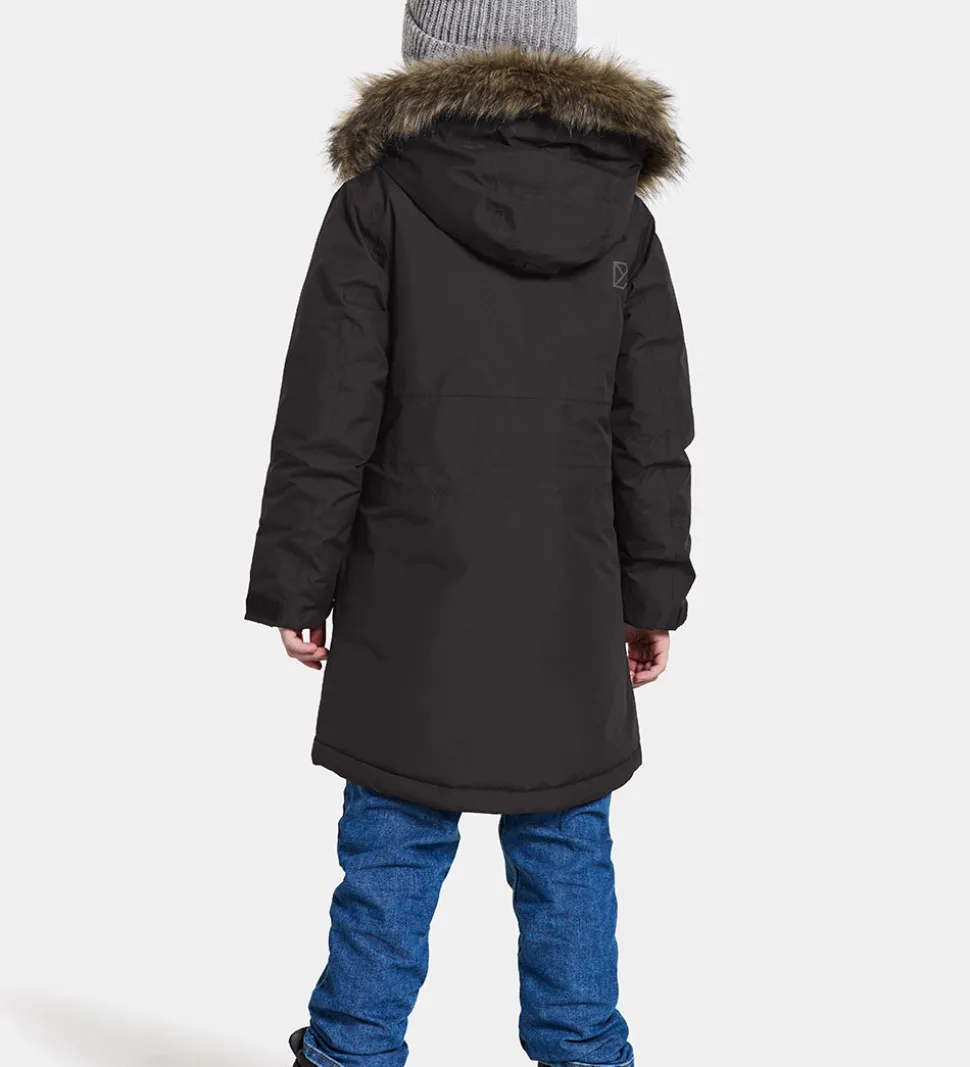 Didriksons vinterfrakken er en lang model, som går ned over lårene. Den har en aftagelig hætte, som er fæstnet med trykknapper og velcro langs den høje krave. Hætten har en flot, imiteret pelskant, der kan tages af ved hjælp af skjulte trykknapper. I toppen kan hætten justeres med velcrorem.