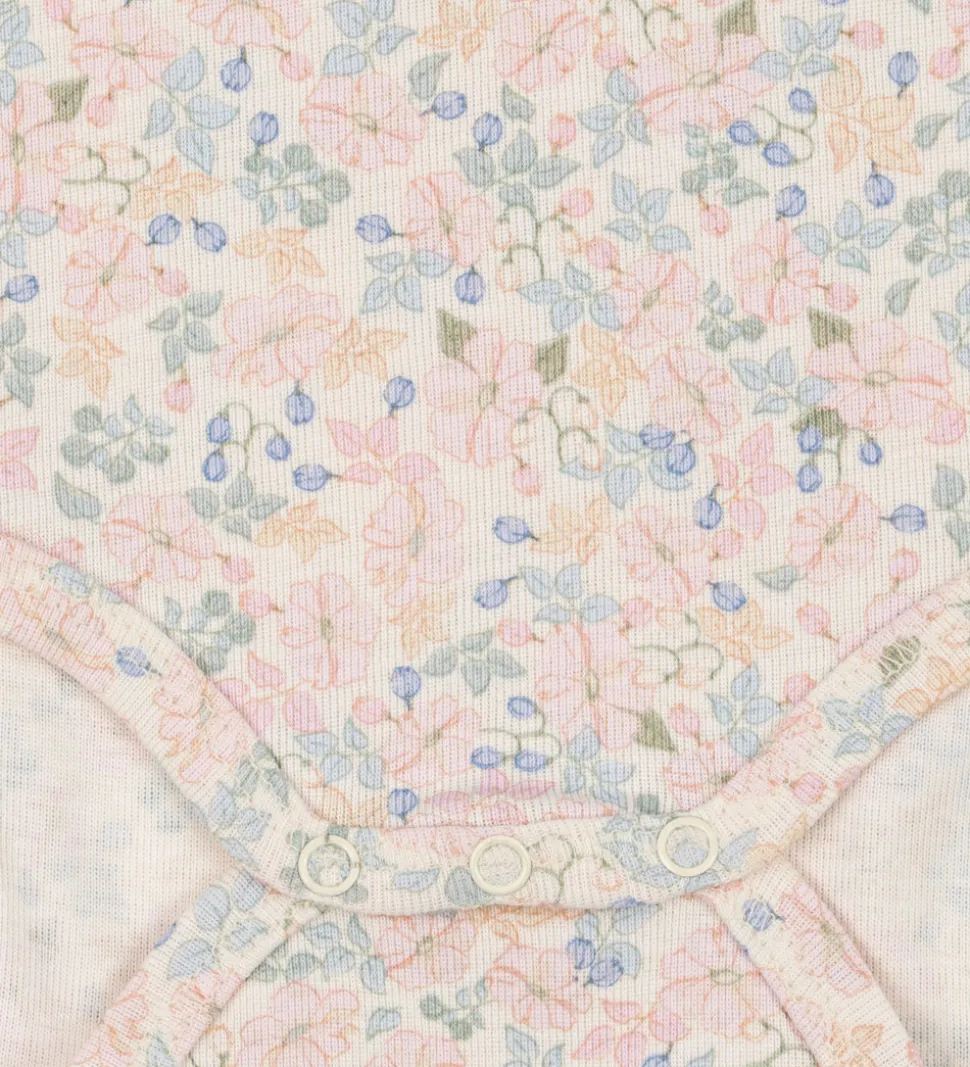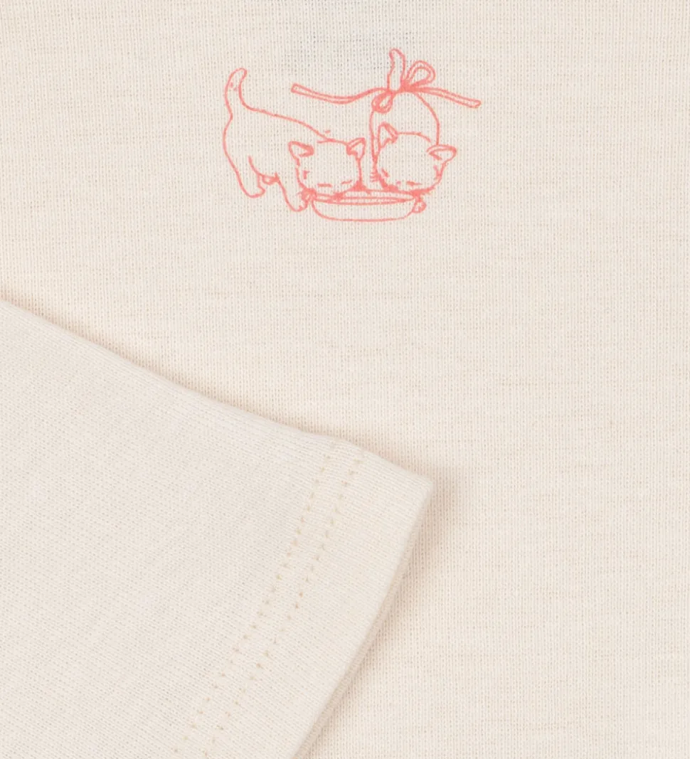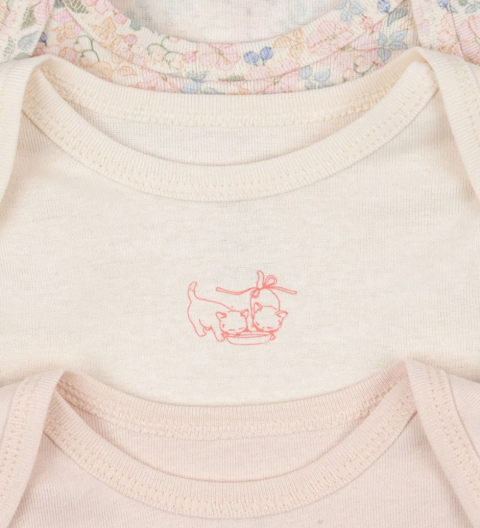 Bløde Fanga Fontana bodyer med lange ærmer solgt i en 3-pak. En af bodyerne er ensfarvet rosa med et lille katteprint, en anden har et delikat blomstermønster i forskellige, lyse farver, og den tredje er cremehvid med et diskret katteprint foran.