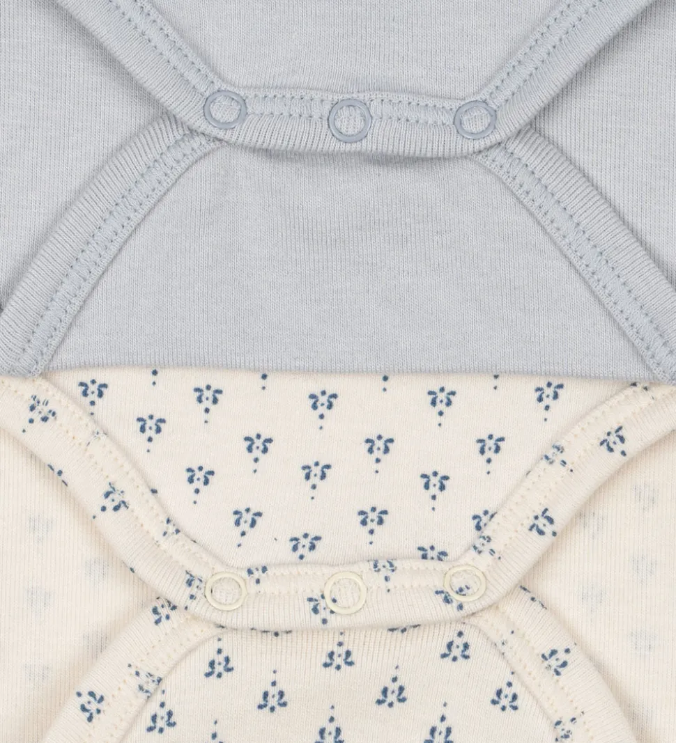 Elegante Fanga Fontana bodyer med lange ærmer i en 2-pak. En i lyseblå med katteprint og en anden i cremehvid med et diskret, blåt mønster.