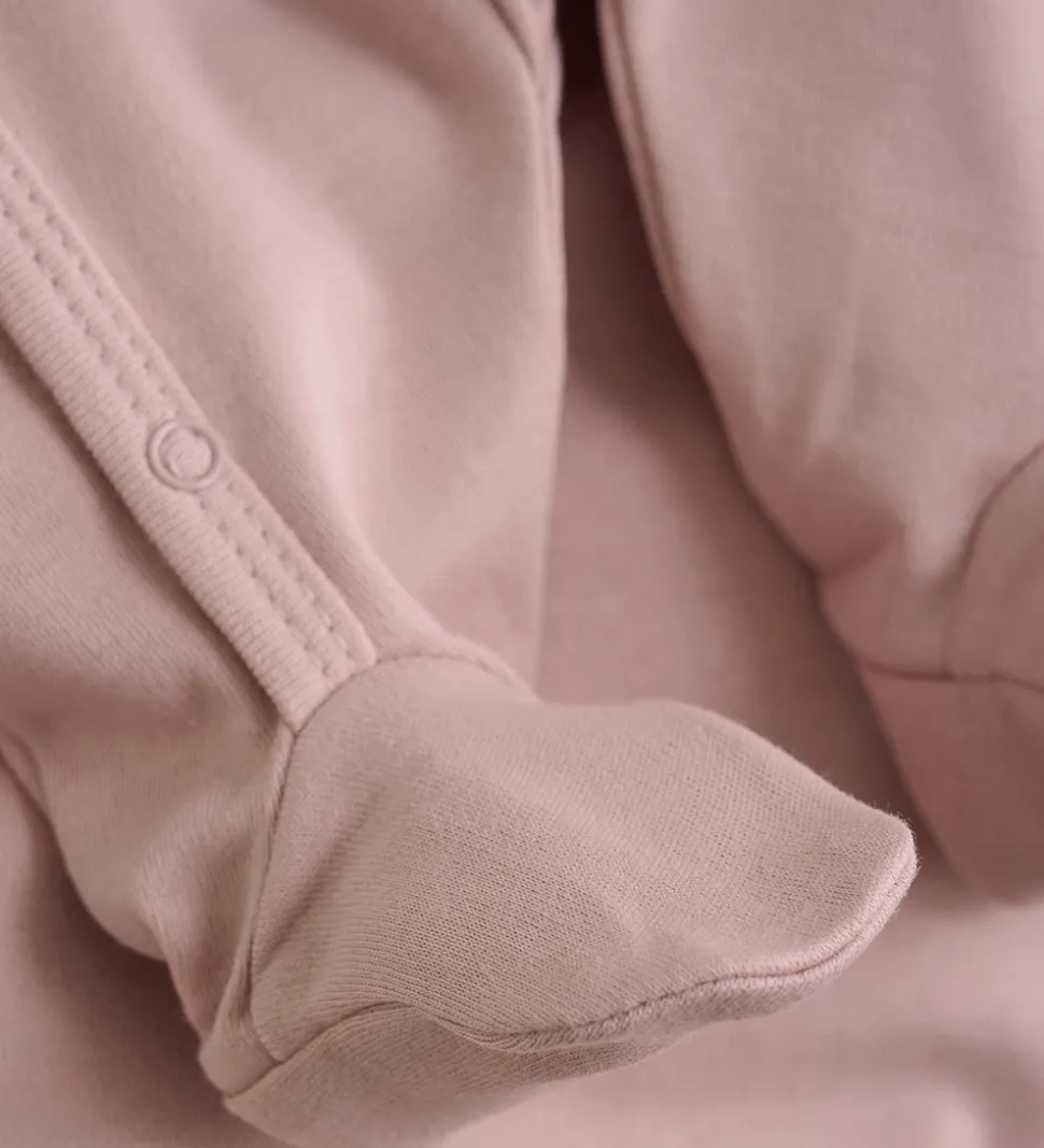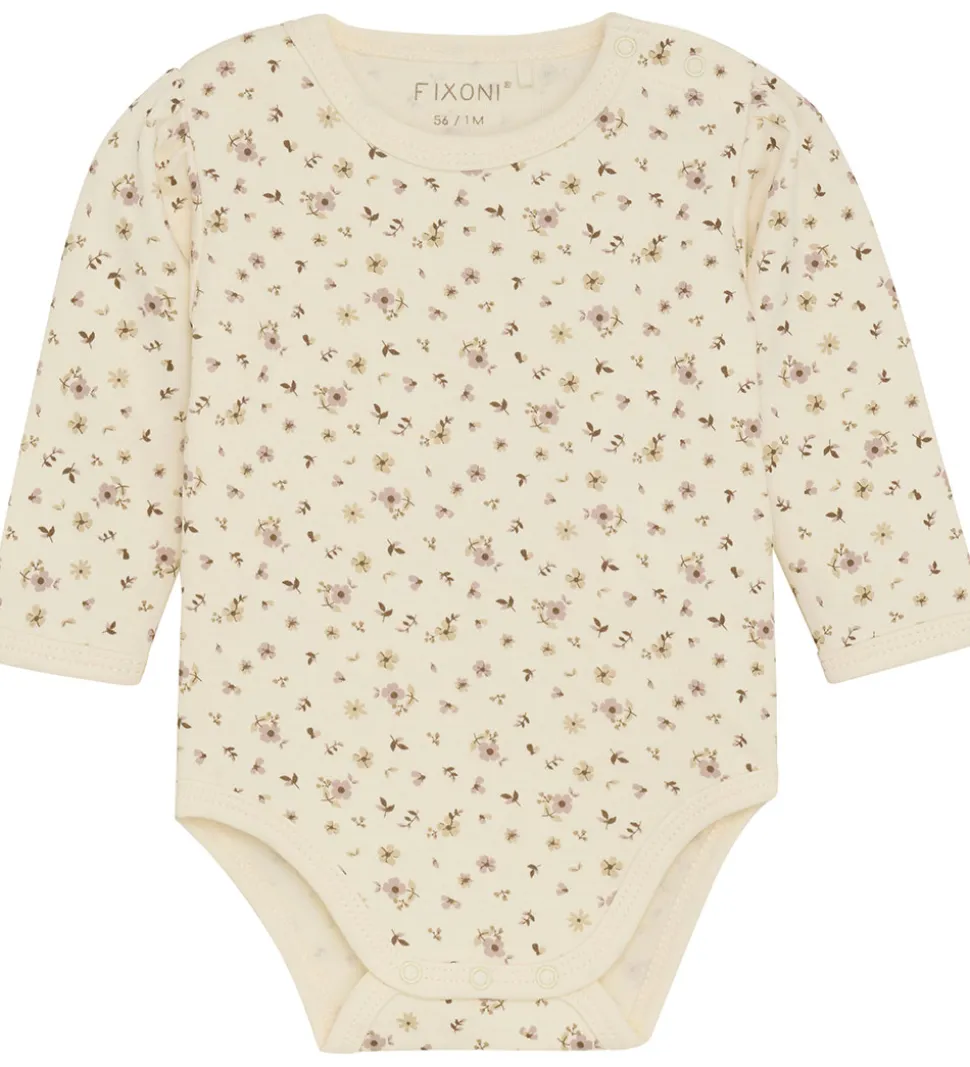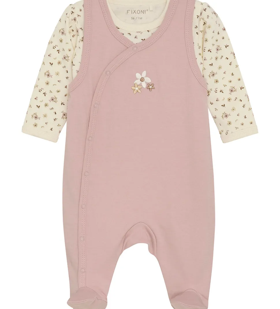 Sød Fixoni sparkedragt og body. Sparkedragten er rosa med broderede blomster i hvid og brun fortil, og bodyen er hvid med et alloverprint med blomster i rosa nuancer.