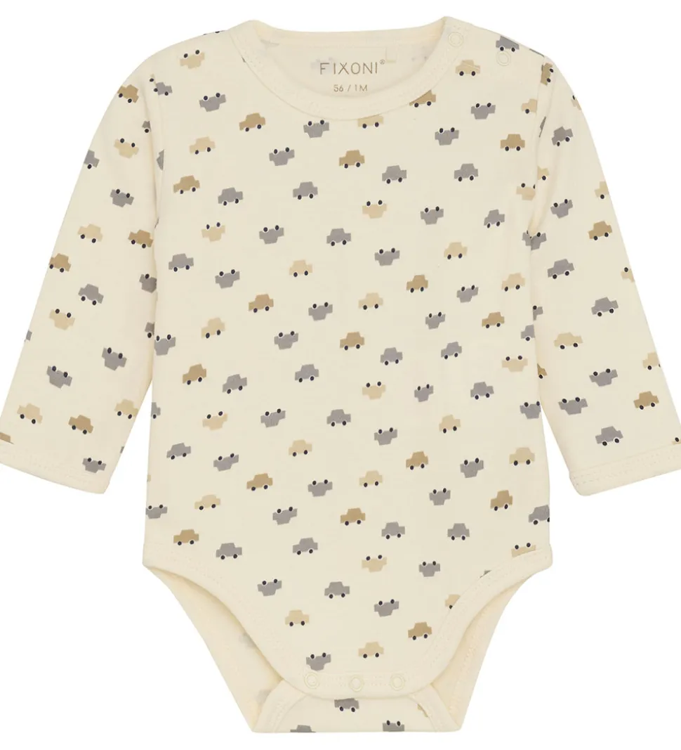 Flot Fixoni sparkedragt og body. Sparkedragten er støvet blå med en hvid bil broderet fortil, og bodyen er hvid med et alloverprint med biler i blå og brune nuancer.