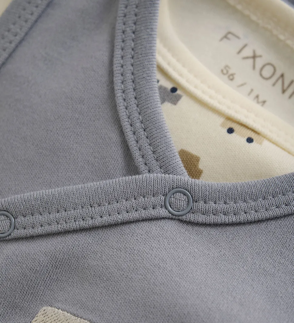 Fixoni bodyen har lange ærmer, og den åbnes ved den venstre skulder med trykknapper. Mellem benene er der tre trykknapper.