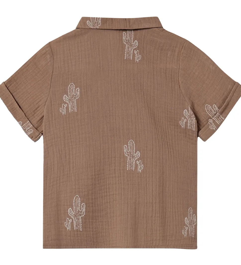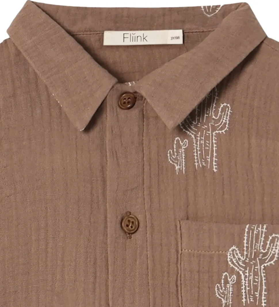 Elegant Fliink skjorte med korte ærmer i en brun farve med et kaktusprint i en lysere nuance. Fliink skjorten har klassisk krave og knaplukning foran samt en lille lomme på brystet.