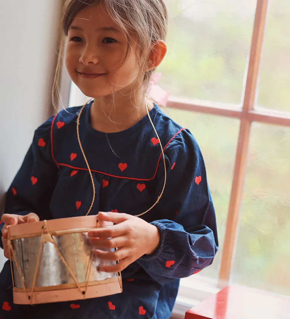 Imponerende Flöss kjole i en mørkeblå denim med broderede, røde hjerter over hele stoffet. Kjolen fra Flöss har lange ærmer og en blød, rund halsudskæring med smukke røde pipe-detaljer.