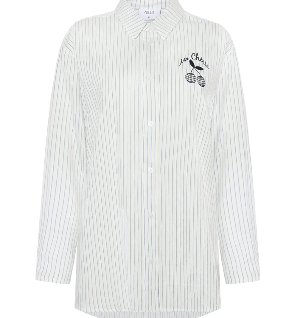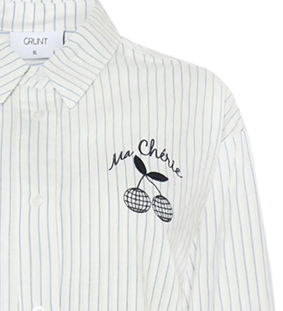 Elegant Grunt skjorte i hvid med smalle blå striber. Skjorten har et charmerende “Ma Chérie” kirsebærbroderi på brystet i sort, som tilføjer et unikt touch til det klassiske design. Grunt kombinerer stil og komfort.