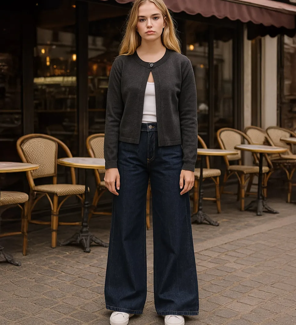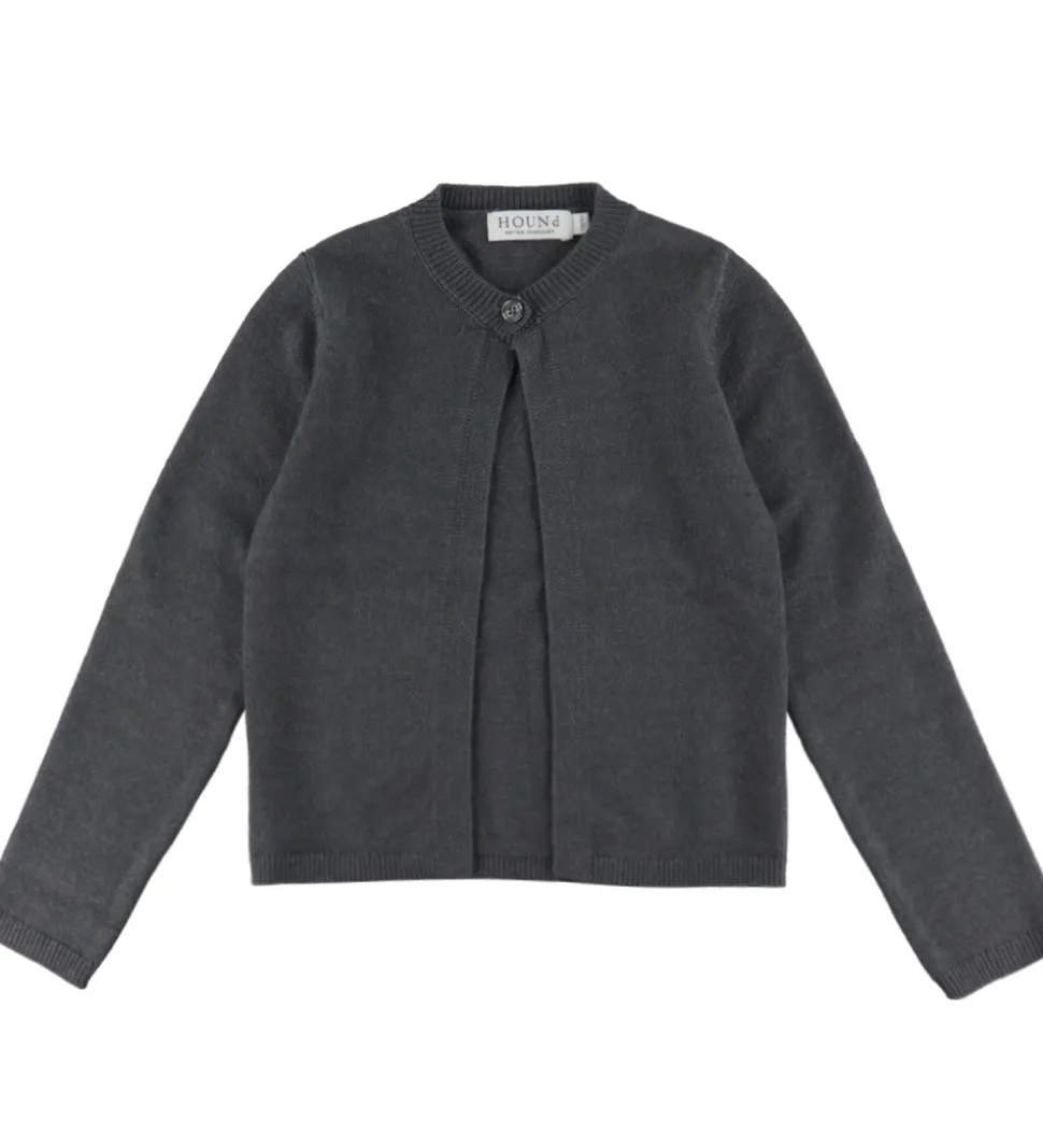 Elegant Hound cardigan i mørkegrå strik. Cardiganen har ribkanter ved alle åbningerne, der tilføjer en klassisk detalje.