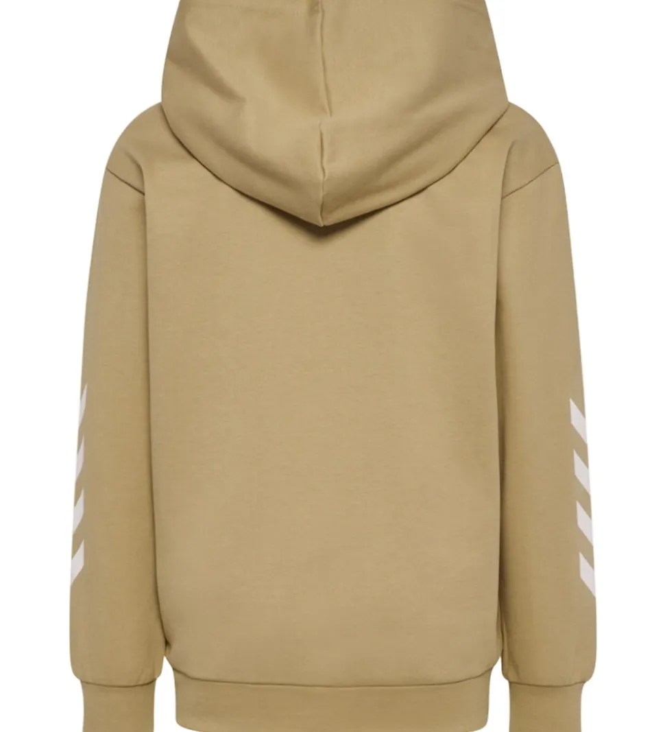 Moderne Hummel hættetrøje i en varm, beige nuance. Foran pryder et hvidt Hummel logo brystet, hvilket giver et stilfuldt udtryk. Hættetrøjen har en praktisk kængurulomme og ribkanter ved ærmerne og i livet, der sikrer en god pasform.