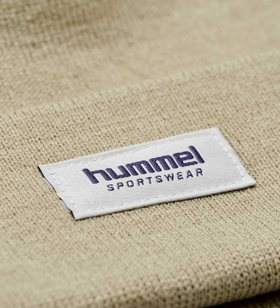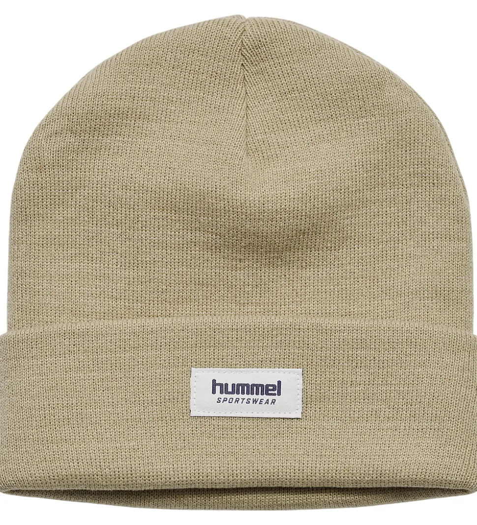 Flot Hummel hue i lysebrun i en strikket kvalitet. Huen består af to lag, og langs kanten har den et bredt ombuk.