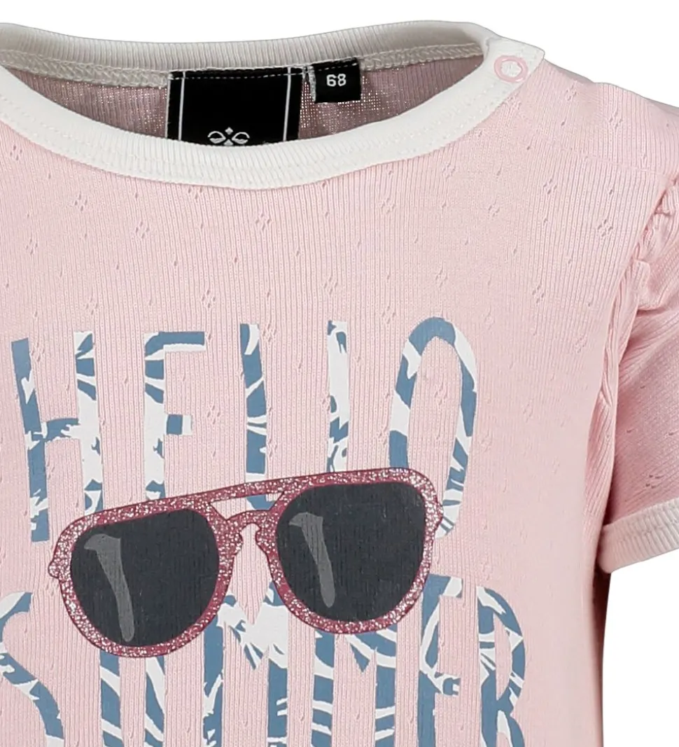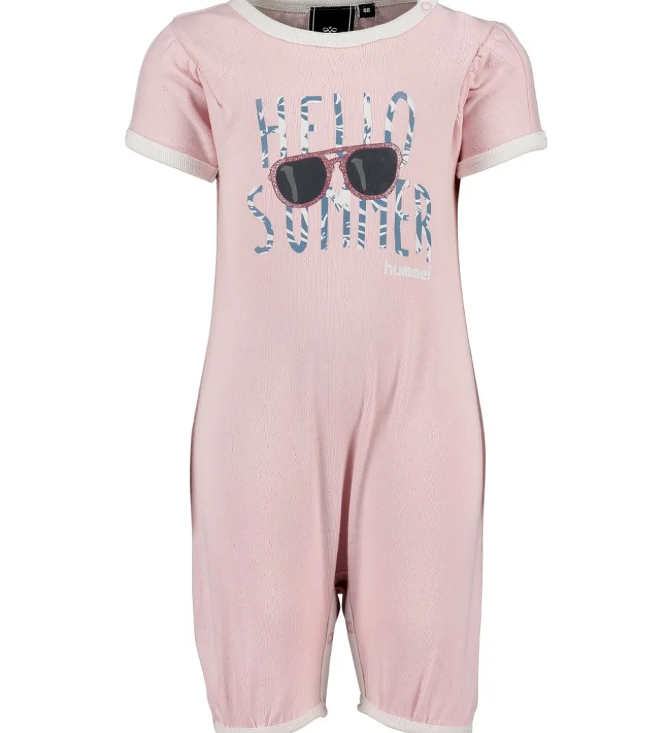 Sød Hummel sommerdragt i sart rosa med et fint hulmønster og hvide kanter. På fronten er der et flot print af et par mørk rosa solbriller med glimmer i. Bagved står der “Hello Summer” med bogstaver med et flot mønster i rosa og koksgrå. Nedenunder står der “Hummel” med hvid skrift.