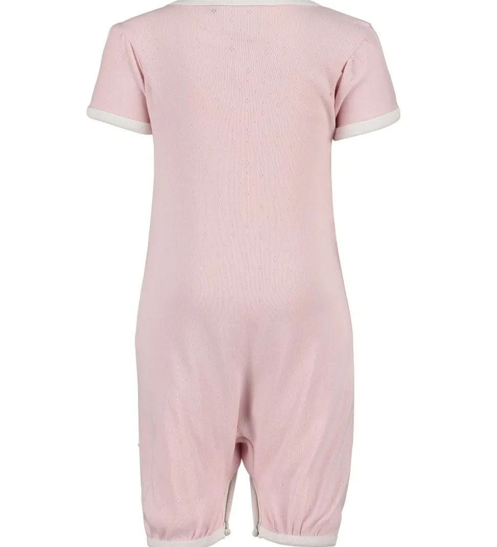 Sommerdragten har helt korte ærmer med søde pufeffekter og korte ben med rynkedetaljer ved kanterne. Ved den ene skulder kan sommerdragten åbnes med to trykknapper, så den er let at få af og på. Sommerdragten kan knappes helt op mellem benene, så det er nemt at komme til bleen.