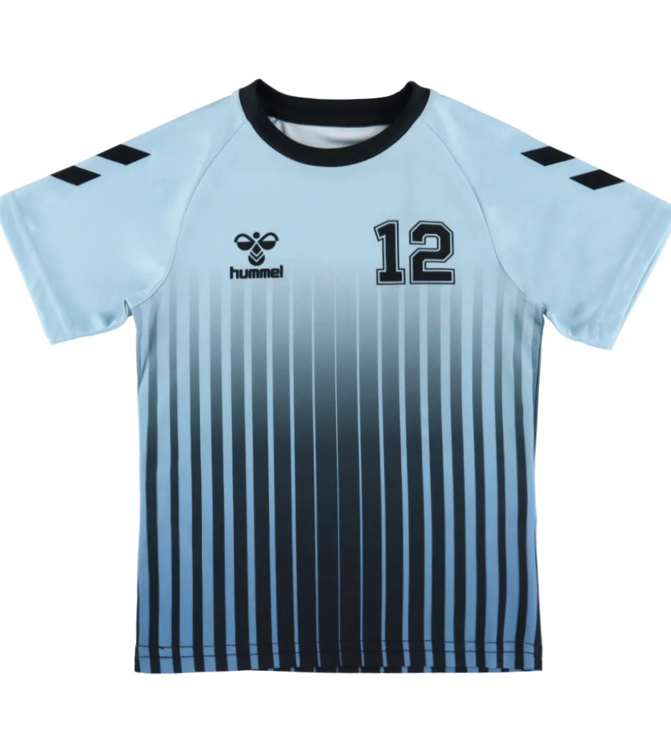 Smart Hummel træningssæt bestående af en t-shirt og et par shorts. Shortsene er sorte med lyseblå Hummel-vinkler på siden af buksebenene, og t-shirten er lyseblå og navy med et stribet mønster, og på ryggen er der et stort, sort print med tallet 23.