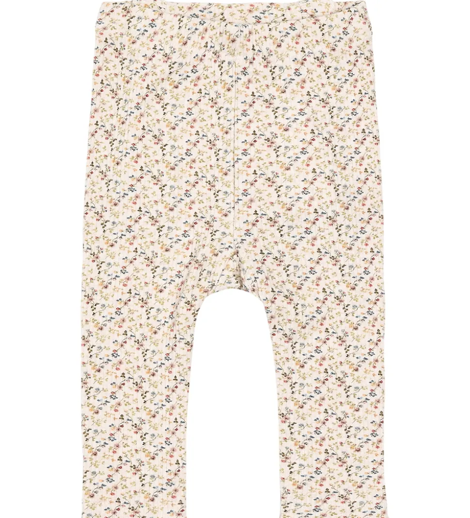 Fine Hust and Claire leggings i beige med blomsterprint i flotte farver. Leggingsene har ribstruktur og elastisk talje. Bagpå er der flotte flæsedetaljer, og i benåbningerne er der blondekanter i rosa. Leggingsene er fremstillet af økologisk bomuld og modal.