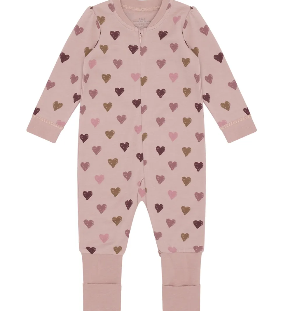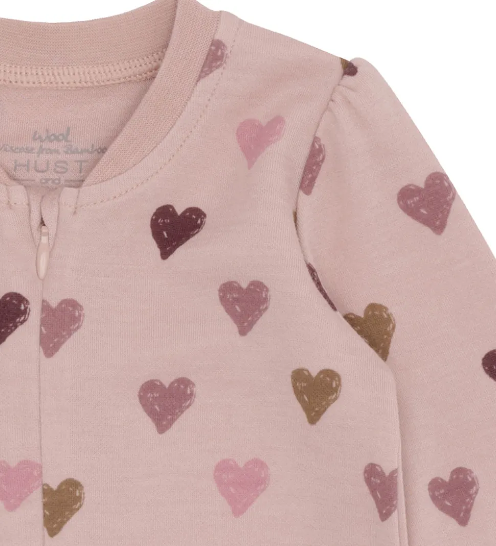 Fin Hust and Claire natdragt i støvet rosa med et alloverprint af hjerter i rosa, lilla og grønne nuancer. Natdragten har lange ærmer og lukkes foran med en skjult lynlås. Natdragten har lange arme og lange ben med brede ribkanter og mulighed for ombuk til lukkede fødder. Den er fremstillet i en blød kvalitet af uld og bambus viskose.