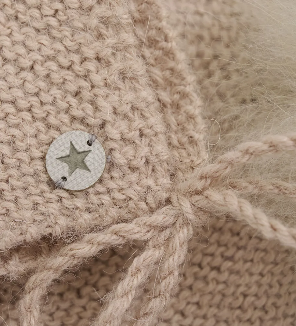Sød Huttelihut babyhjelm strikket af blødt alpakauld i rosa og med en beige pelskvast på toppen.