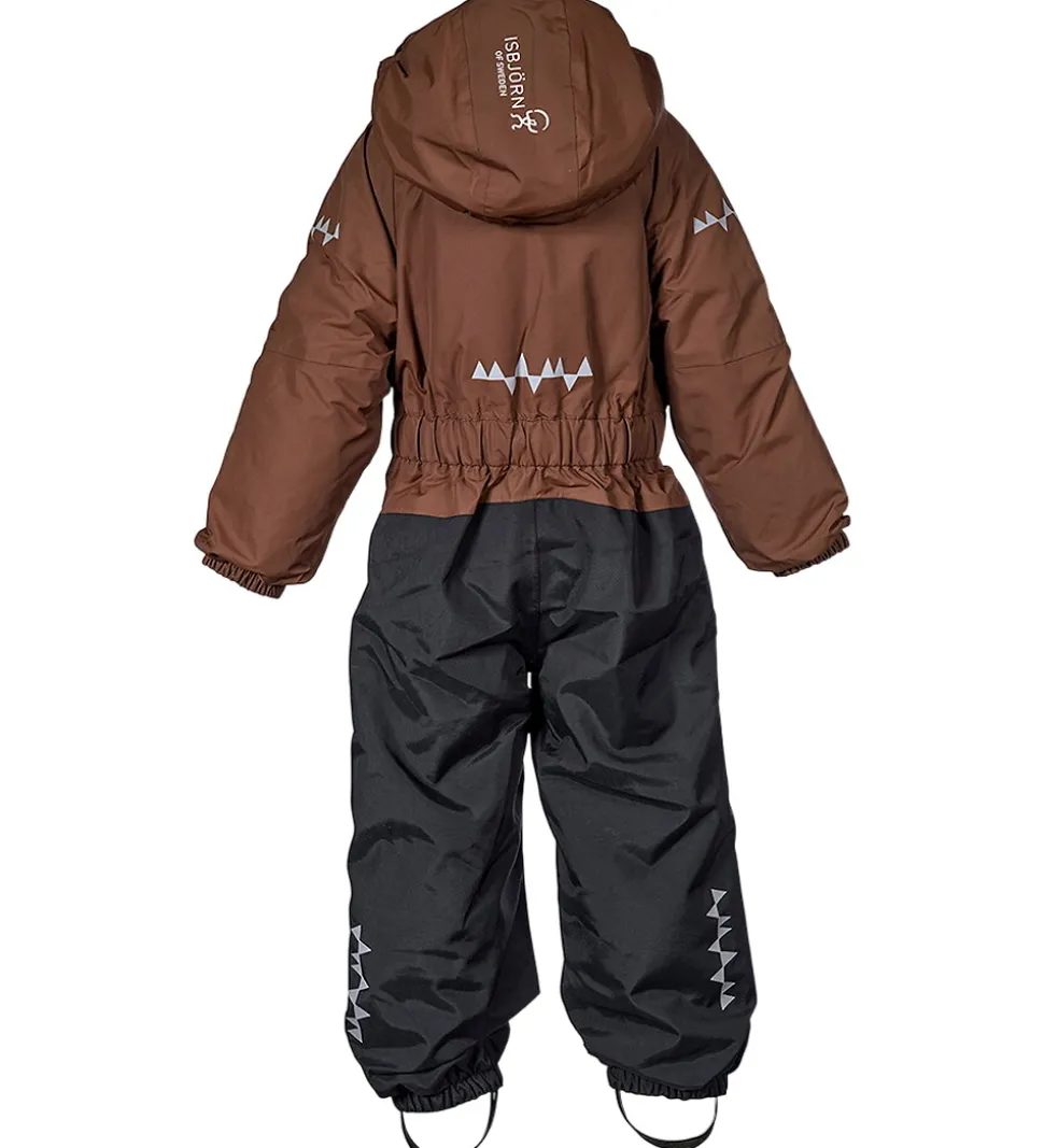Flot Isbjörn Of Sweden flyverdragt i brun og sort. Flyverdragten har hvide logoprint på venstre bryst og hætten samt smarte refleksprint på lænden, begge skuldre og ankler.