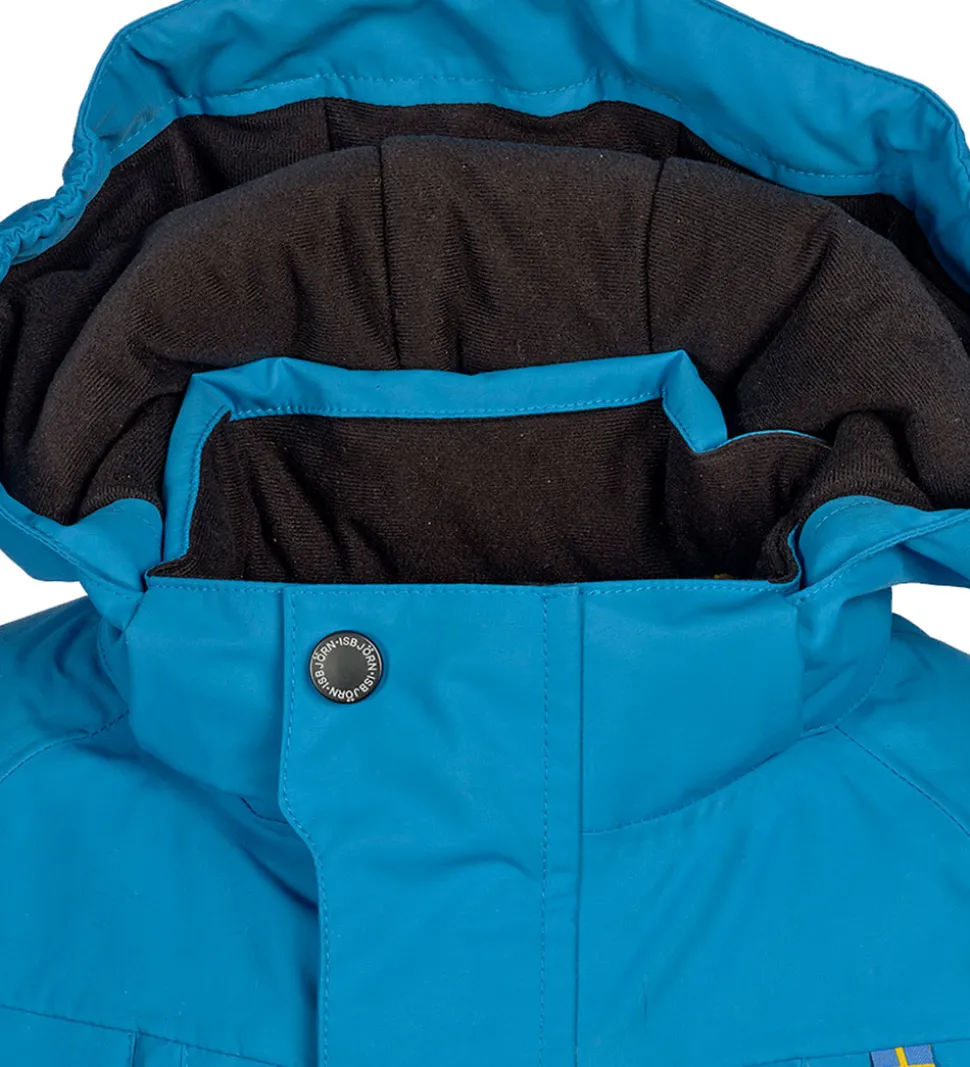 Isbjörn Of Sweden flyverdragten har en aftagelig hætte, som fæstnes på ydersiden af den høje halskrave med velcro og trykknapper. Hætten har en skygge øverst i ansigtsåbningen og elastikkanter i siderne, og den kan justeres med en velcrorem på toppen. Både hætten og halskraven er forede med blødt fleece.