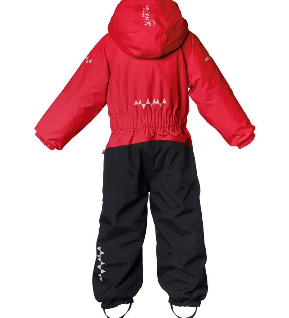 Flot Isbjörn Of Sweden flyverdragt i rød og sort. Flyverdragten har hvide logoprint på venstre bryst og hætten samt smarte refleksprint på lænden, begge skuldre og ankler.