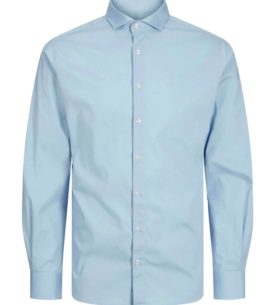 Jack & Jones skjorten har en klassisk, ombukket krave og lange ærmer med ærmeslidser og brede manchetter, der lukkes med knapper, med mulighed for to justeringer. Skjorten åbnes fortil med gennemgående knapper og er lavet i en let og fastvævet kvalitet.