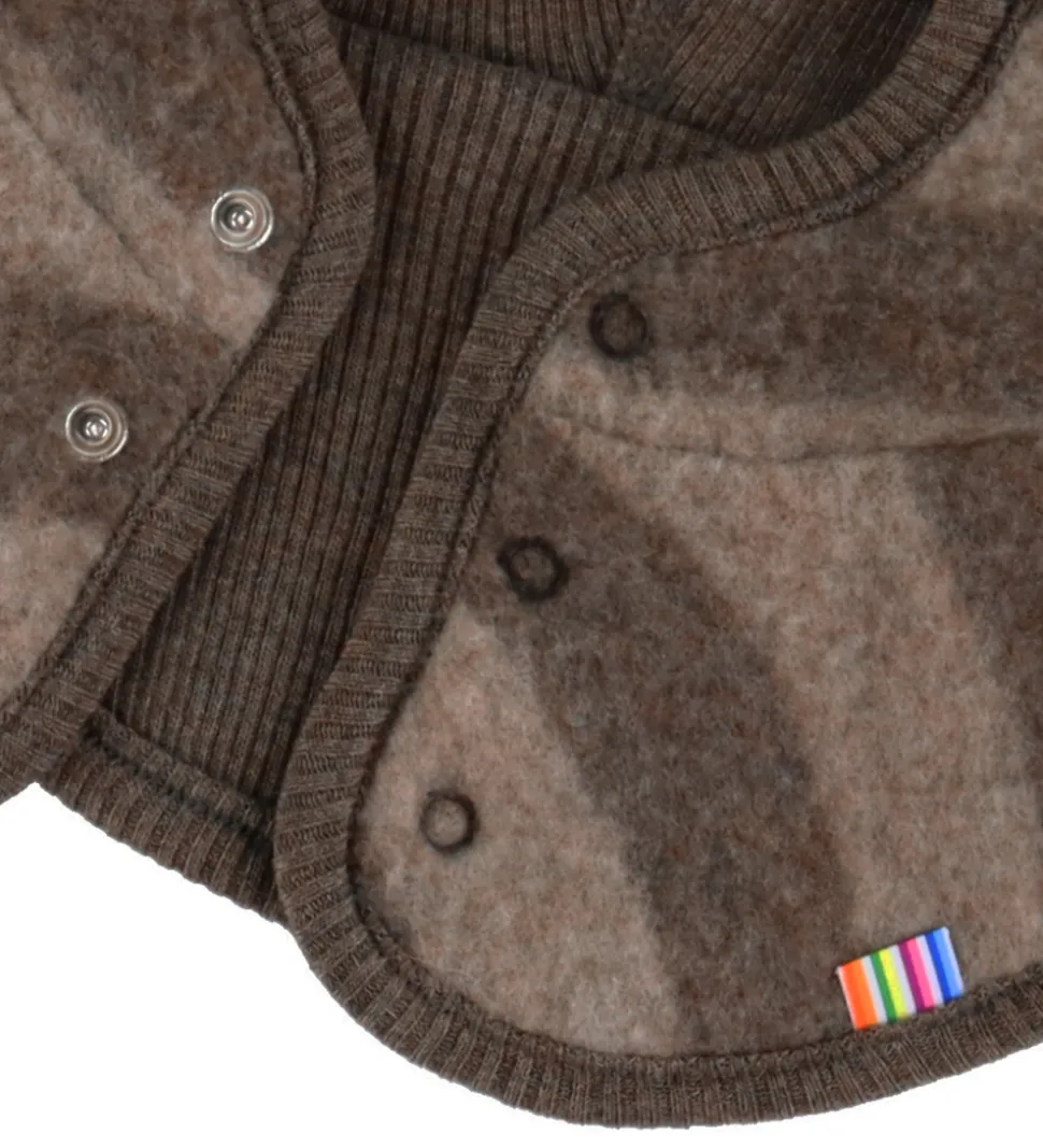 Elegant Joha elefanthue med stribet design i brune nuancer. Joha elefanthuen består af to lag merinould og har en rund hovedform med praktiske trykknapper under hagen.