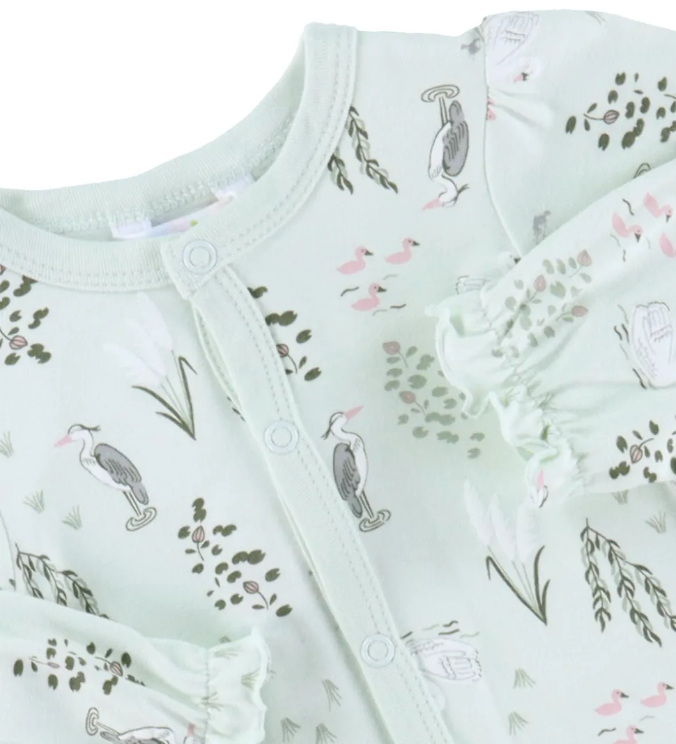Skøn Joha natdragt i lys grøn med alloverprint af søde dyr og planter i hvid, rosa og grønne nuancer. Joha natdragten har en rund halsudskæring, og gennemgående knapper fra halsen til venstre fod, så det er muligt at åbne natdragten helt op. Natdragten har lange ærmer med flæseafslutning og lange ben.