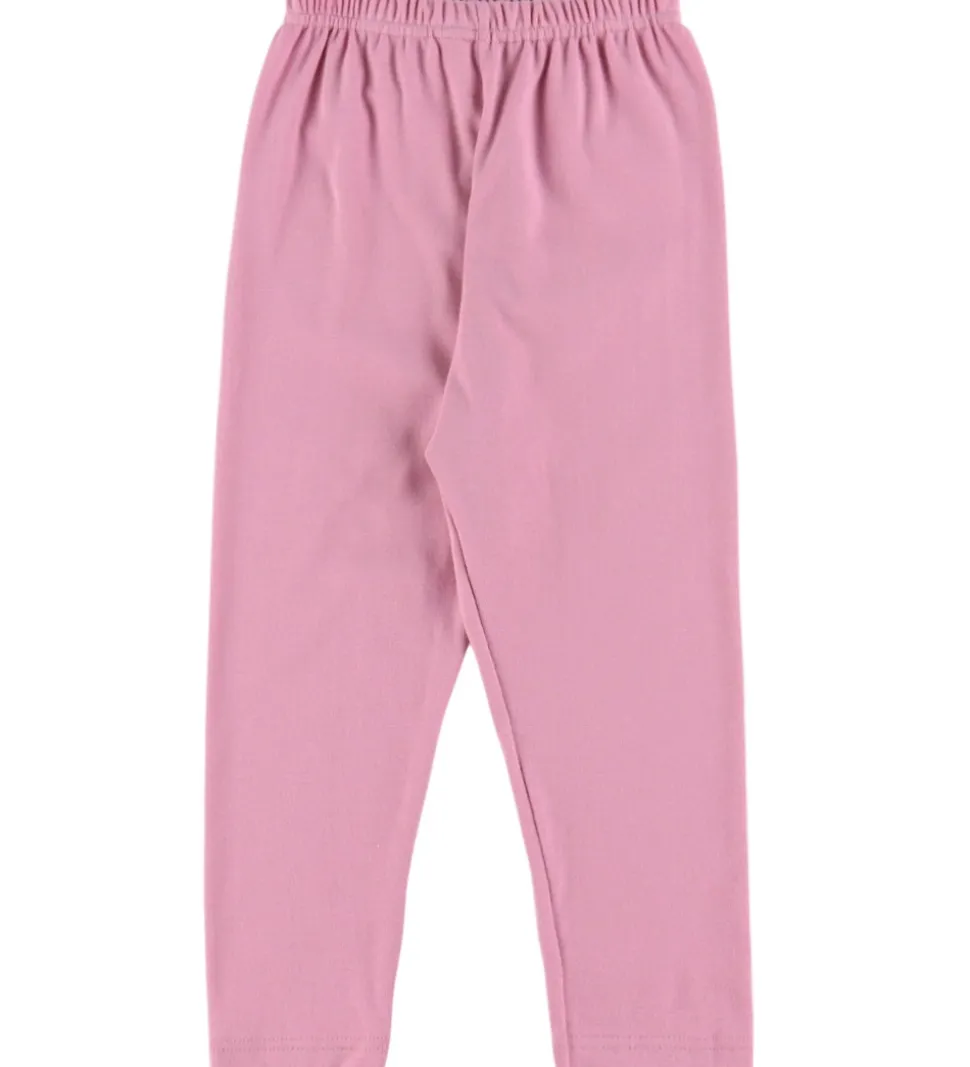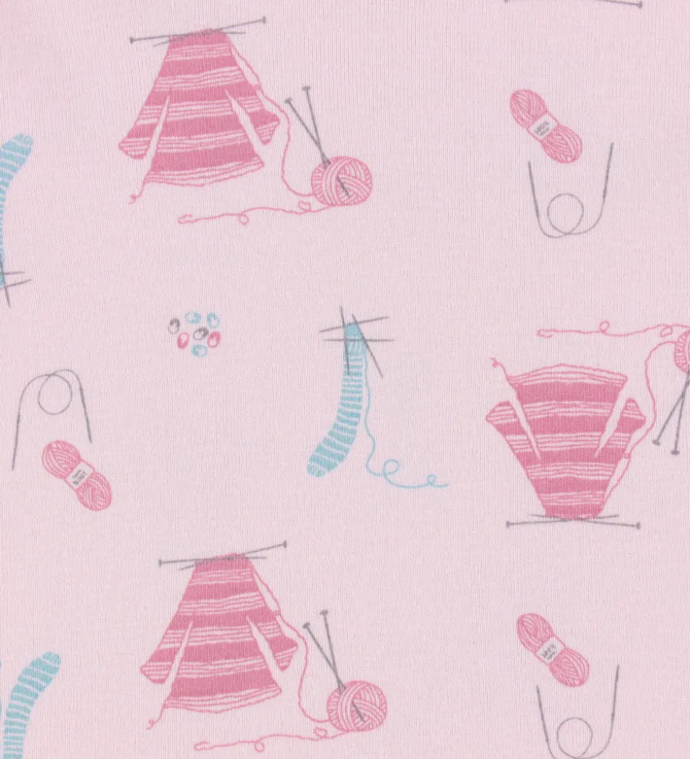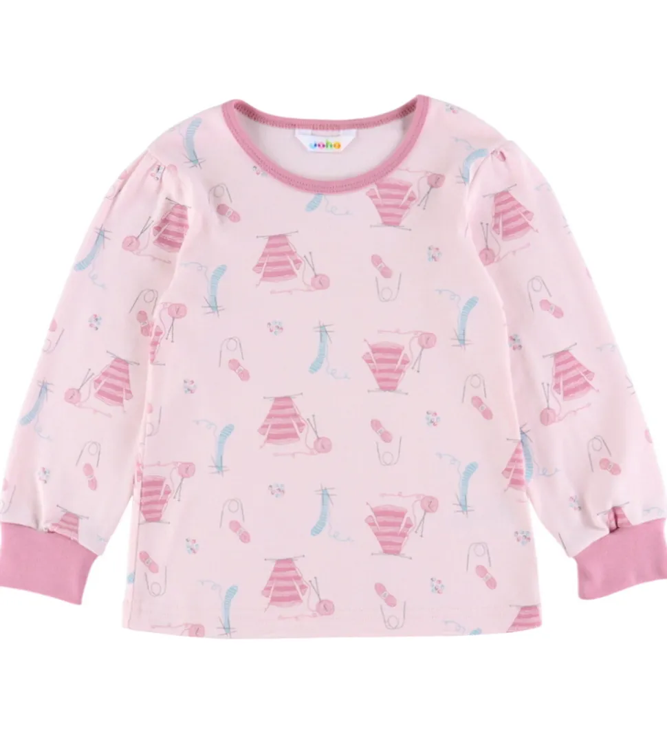 Skønt Joha nattøj bestående af en natbluse og et par natbukser. Natblusen er lys rosa med print med strikketema og mørkere rosa kanter. Den har en rund halsudskæring og lange ærmer med puf ved skuldrene og brede ribkanter. Natbukserne er mørk rosa. De har en god elastik i taljen, som giver en god pasform.