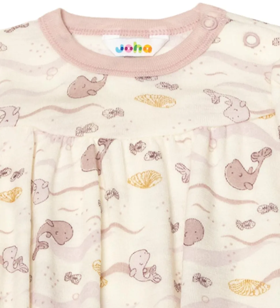 Lækker Joha sommerdragt i off white, med print af hvaler i støvet rosa. Kanterne i halsen og benene er støvet rosa.