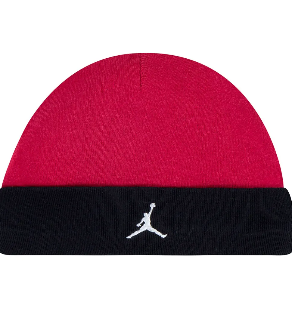 - Hue i rød med en sort kant og et hvidt logo broderet fortil.