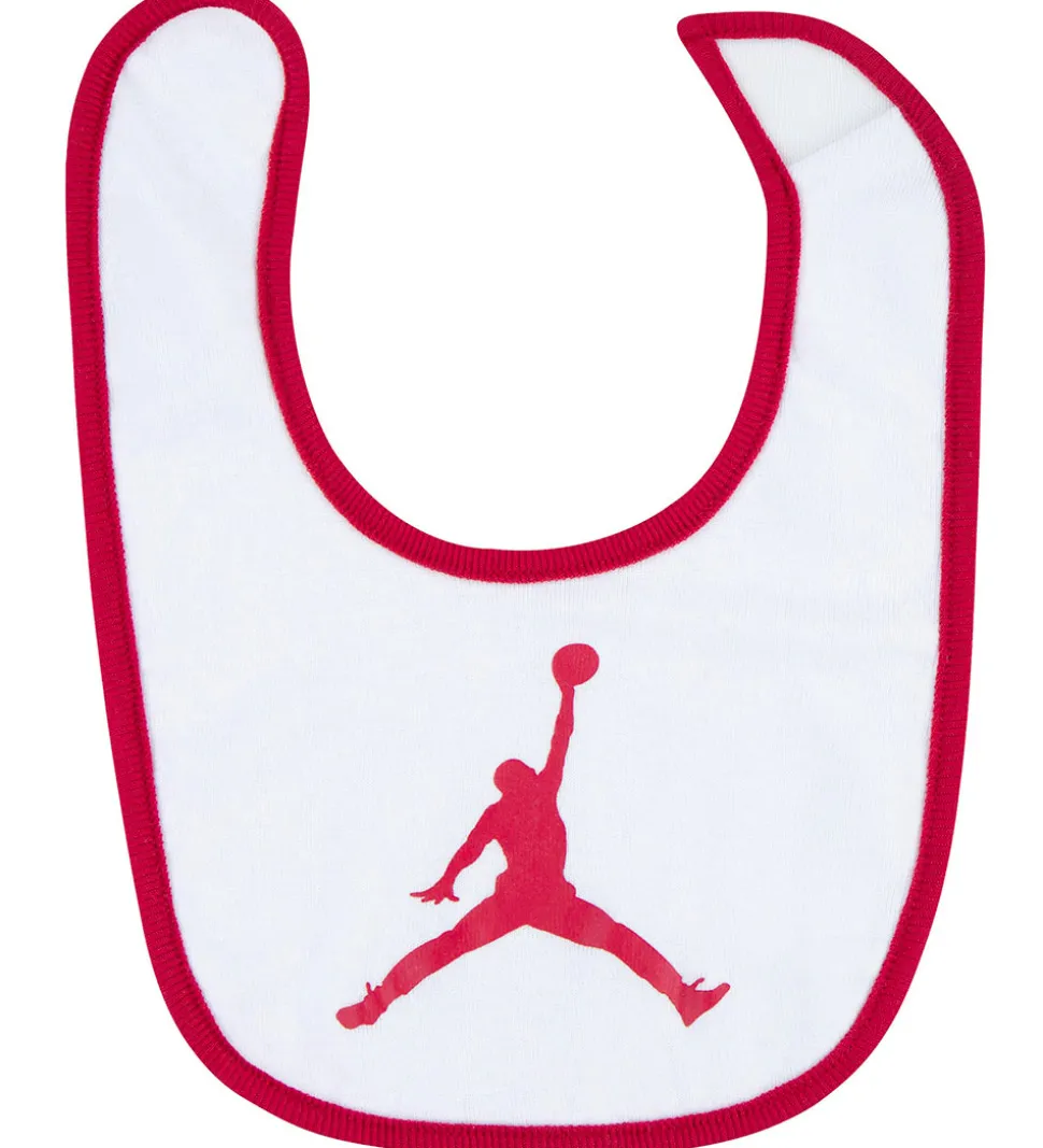 - Hagesmæk i hvid med røde kanter og et rødt logo trykt fortil.