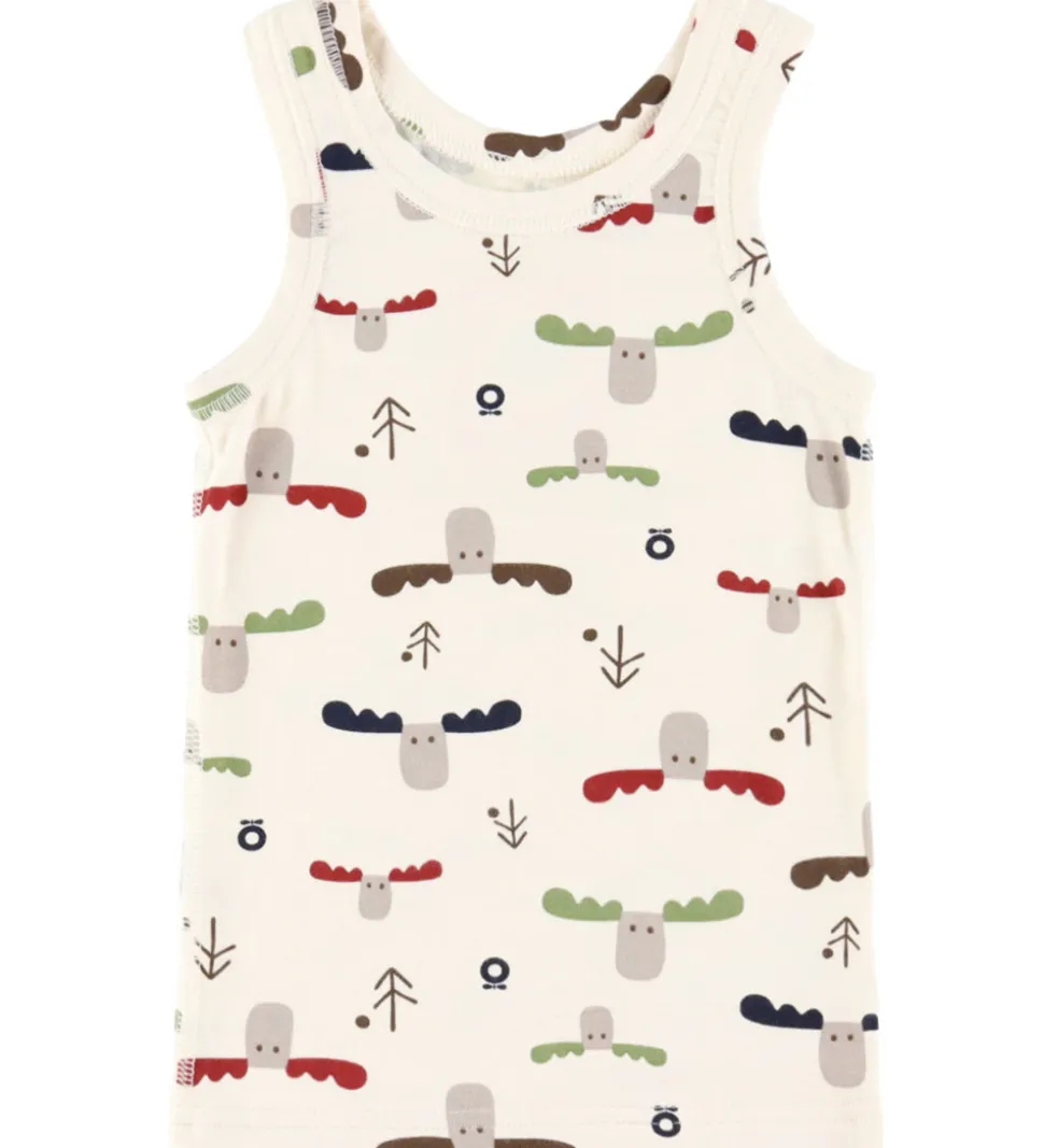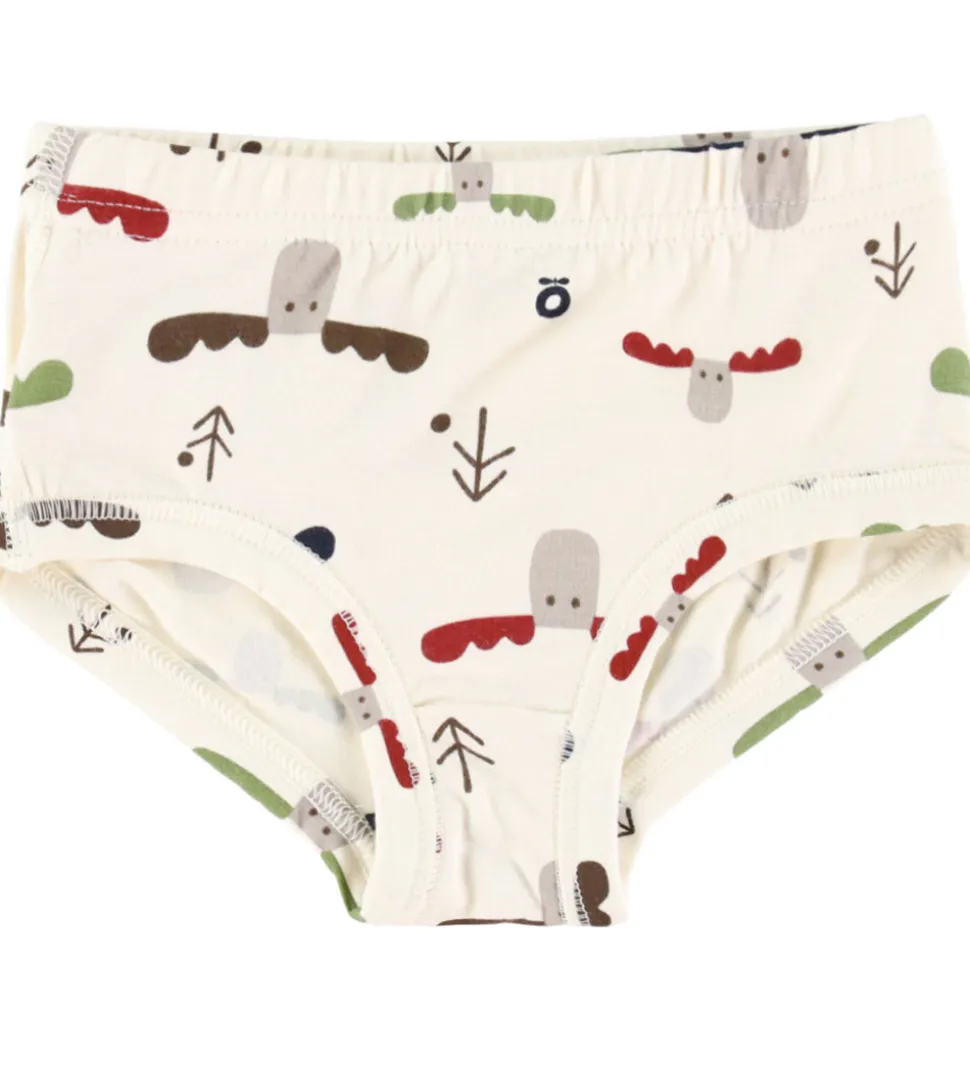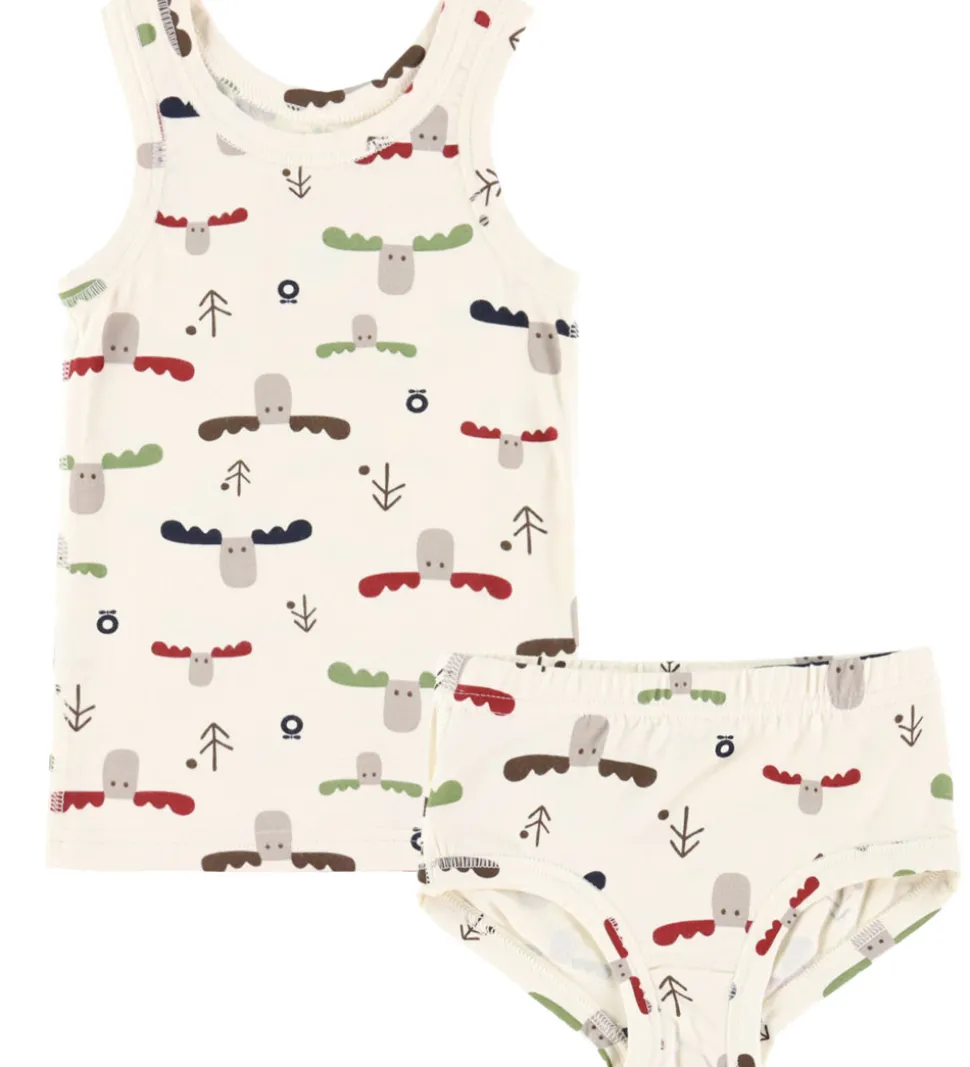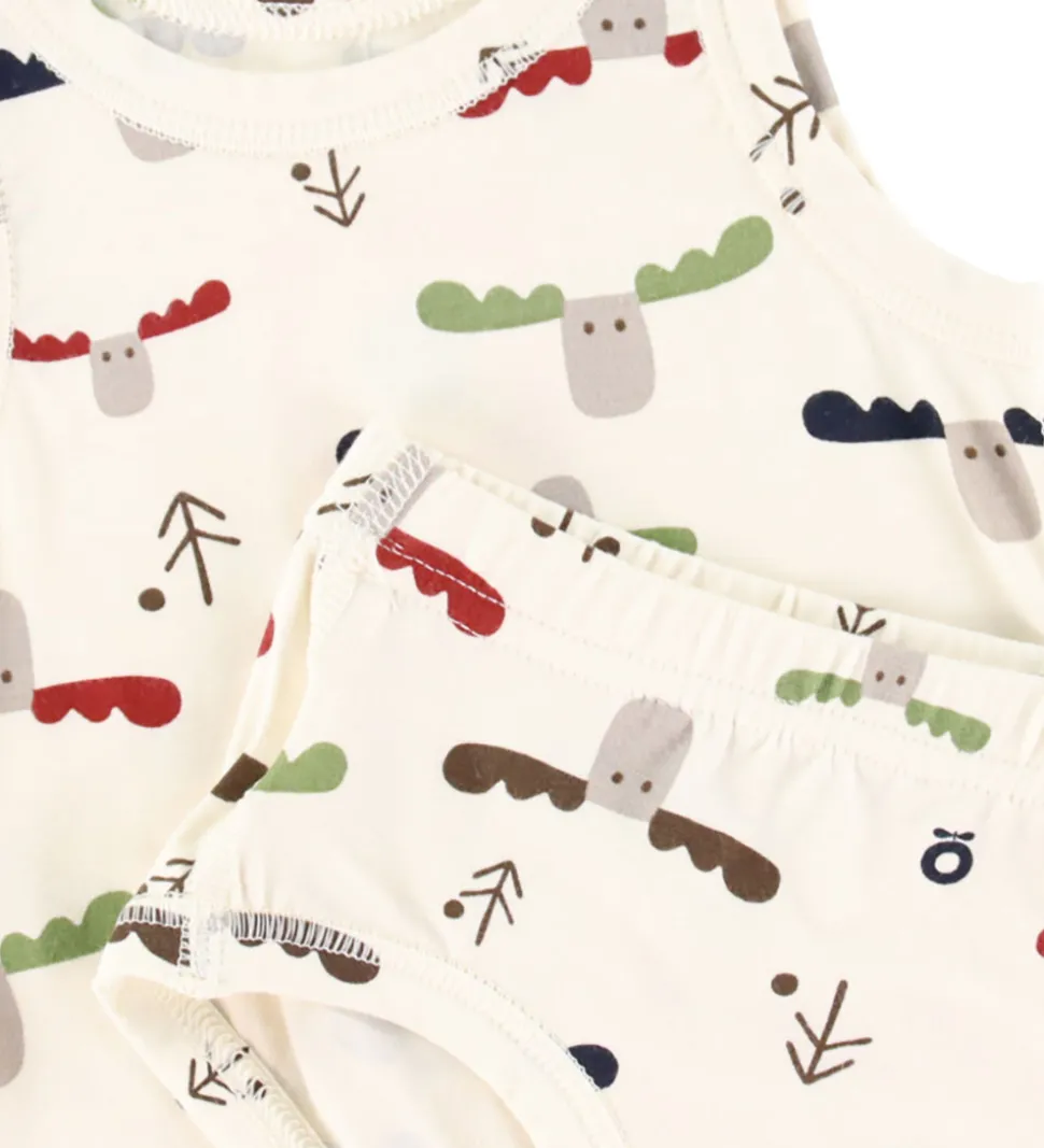 Charmerende Katvig undertøj bestående af en undertrøje og et par trusser i råhvid med alloverprint af elgehoveder og logoer i forskellige farver. Undertrøjen har brede skulderstropper og en rund halsudskæring. Trusserne har en god elastik i livet, som sikrer en god pasform. Undertøjet er fremstillet af bambus viskose.