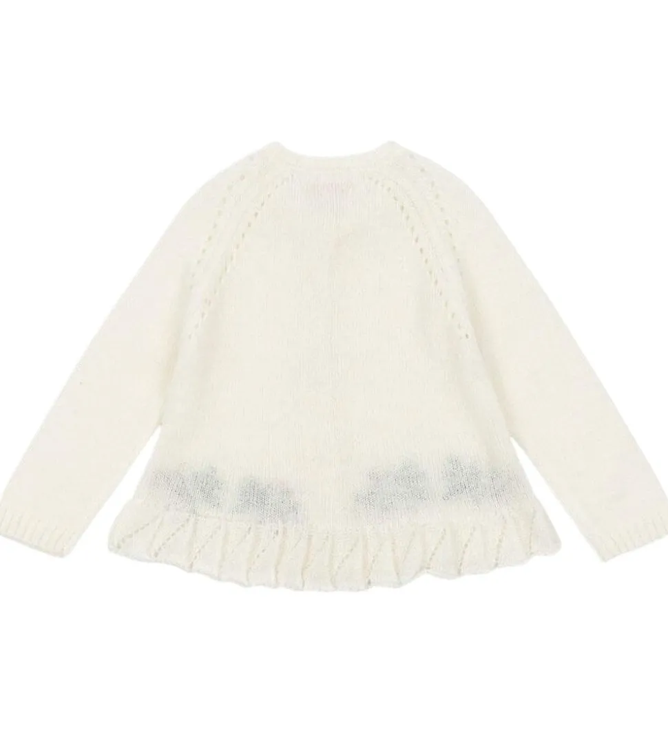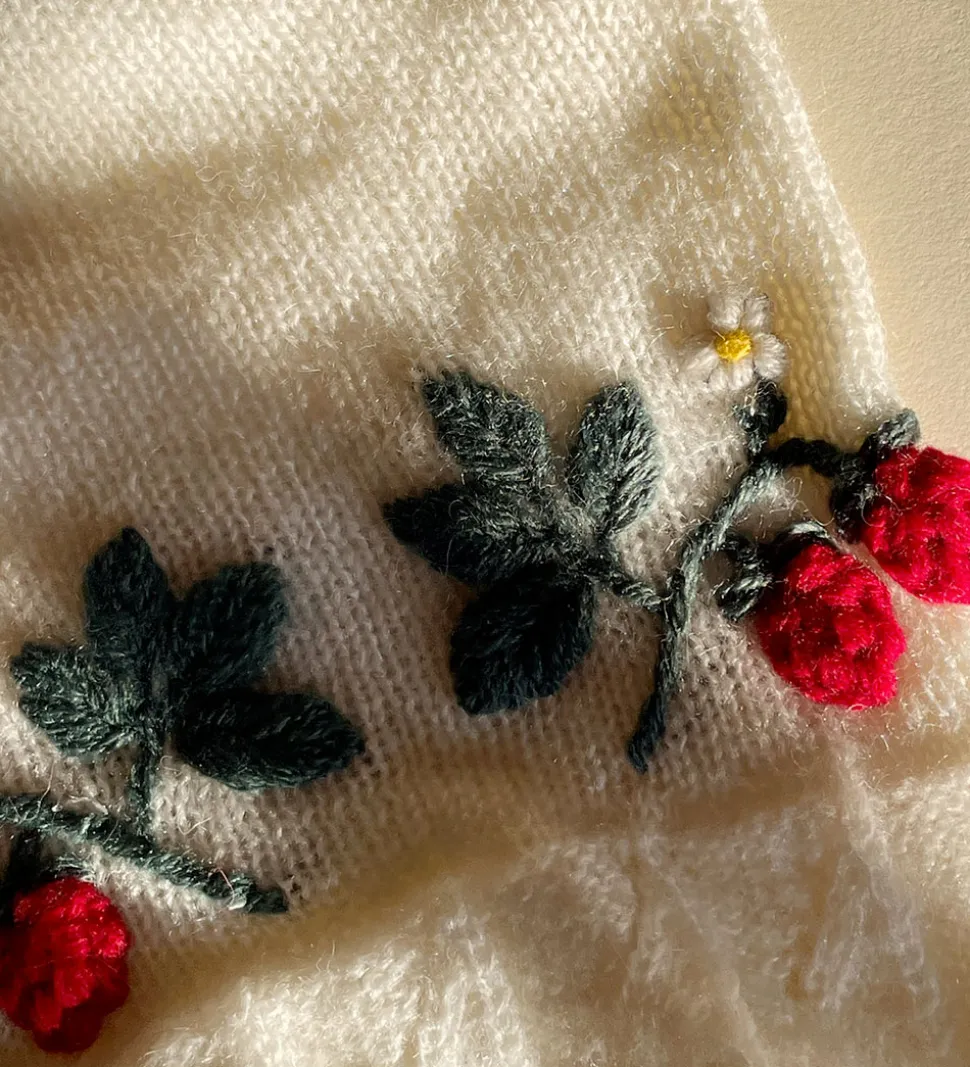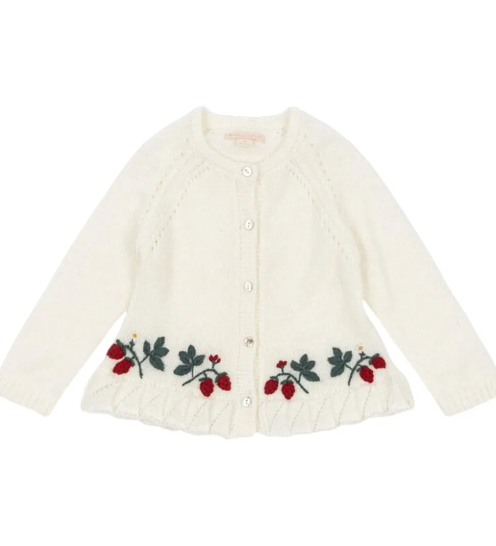 Cardiganen har et elegant design med delikate blomsterbroderier langs kanten i røde og grønne nuancer. Den har en rund halsudskæring og er udstyret med en knaplukning foran, der komplementerer den fine strikstruktur.