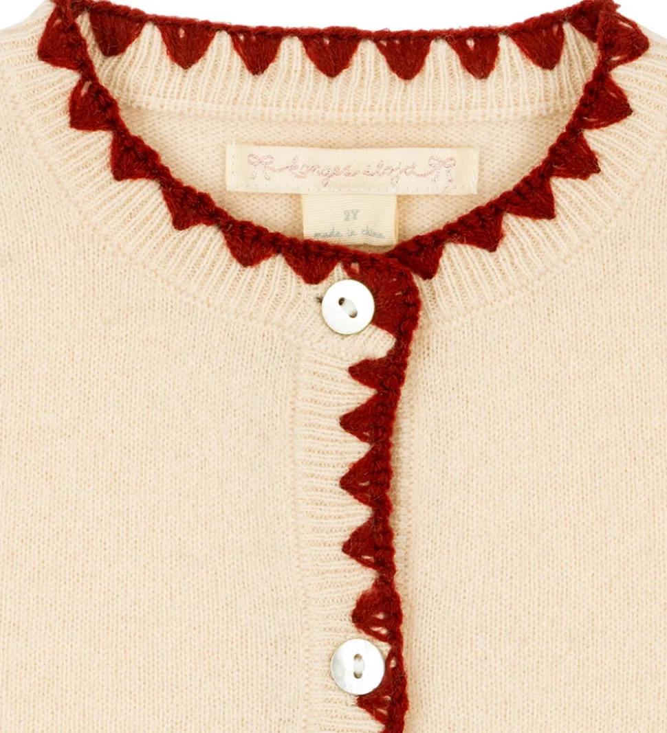 Skøn Konges Sløjd cardigan i creme med et pudderrosa skær med delikate kirsebærbroderier langs kanten fortil og yderst på ærmerne. Cardiganen har lange ærmer og en flot zigzag-kant i rød langs knaplukningen og nederst ved ærmerne. Konges Sløjd cardiganen lukkes med knapper, og den er lavet i en blød, strikket uldkvalitet.