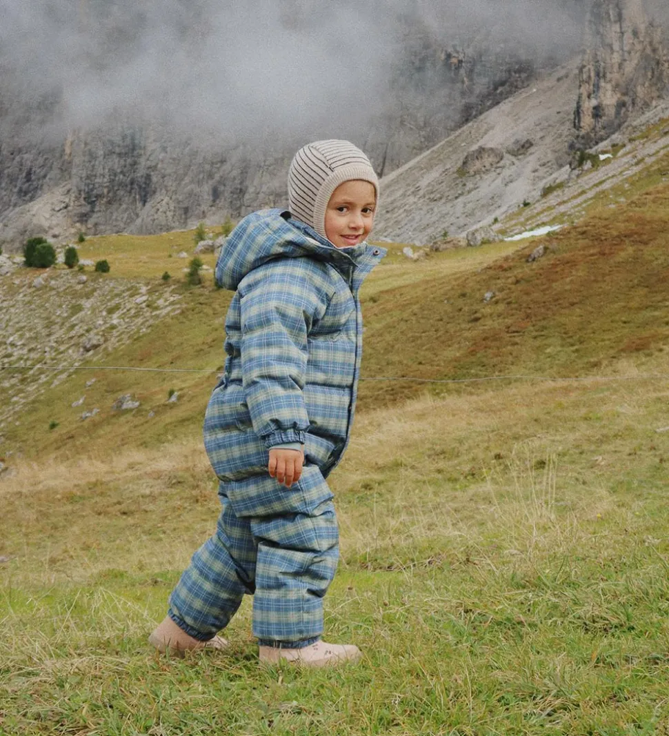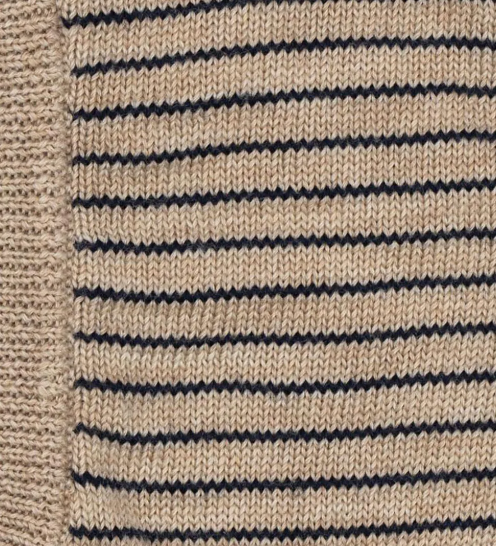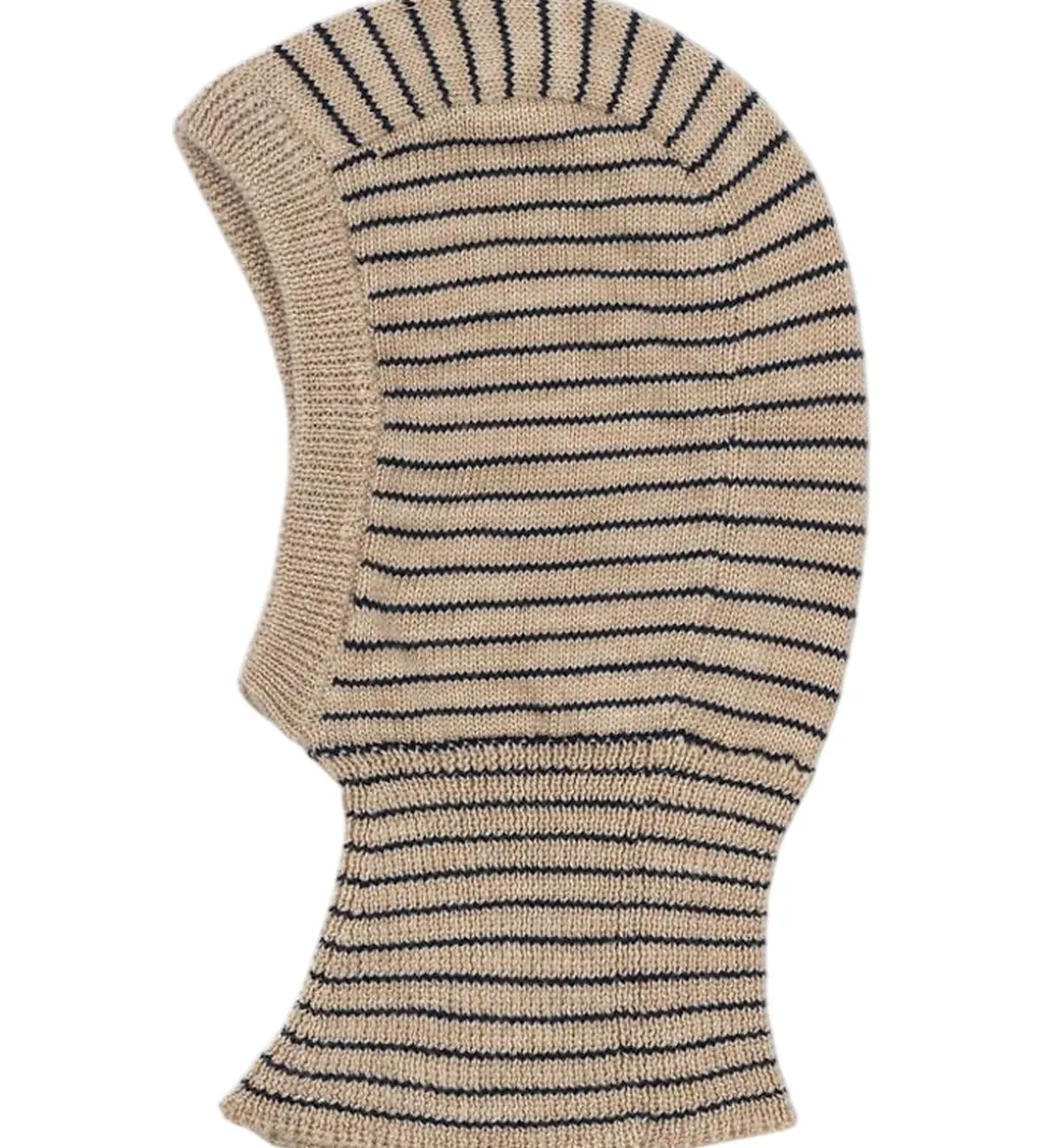 Elegant Konges Sløjd elefanthue med en rund hovedform i beige med smalle, navy striber. Konges Sløjd elefanthuen har et split-design i bunden, og den består af et enkelt lag i en blød strikket merinould.