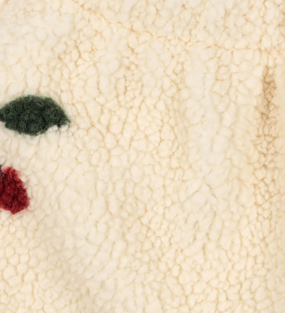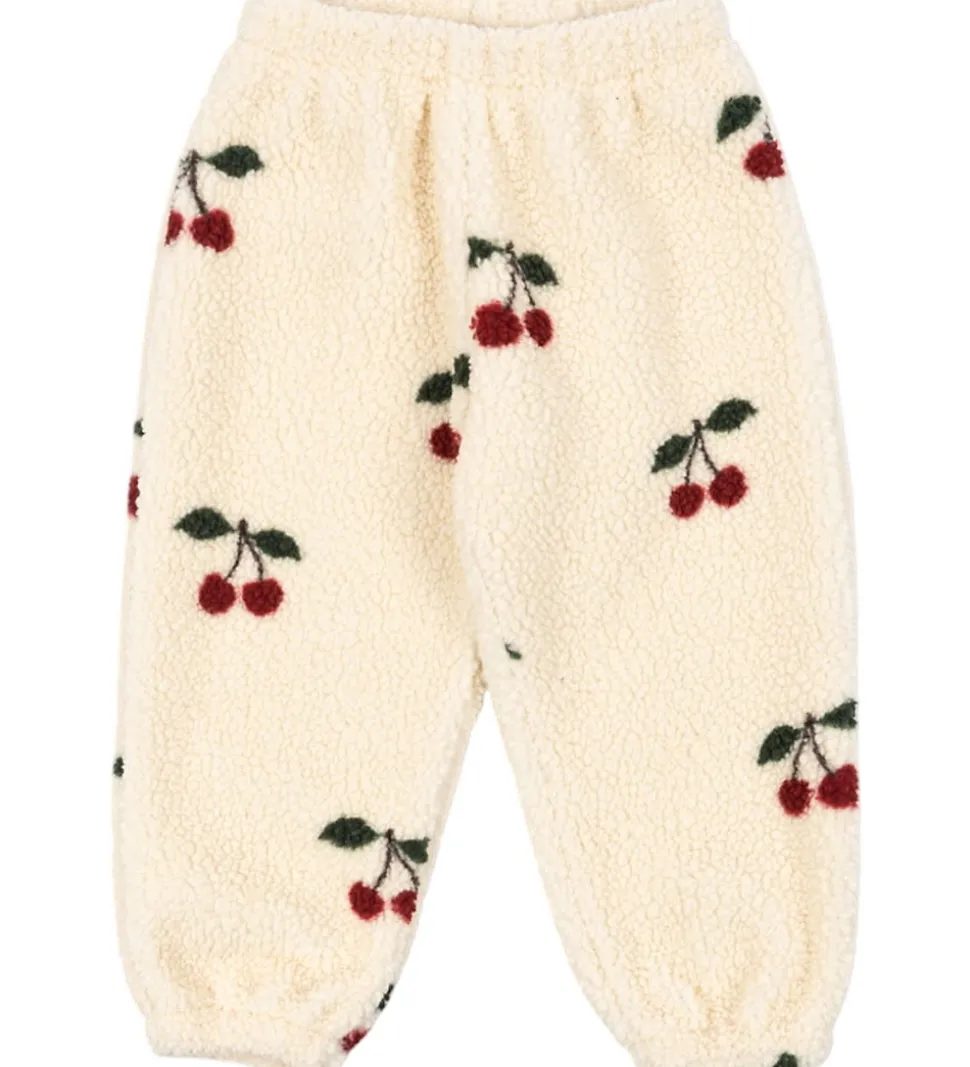Bløde Konges Sløjd fleecebukser i en cremehvid nuance med et charmerende kirsebærmønster. Fleecebukserne har elastik i taljen og ved anklerne, hvilket bidrager til en behagelig pasform.