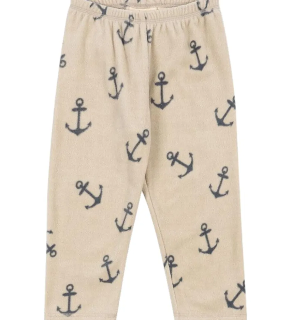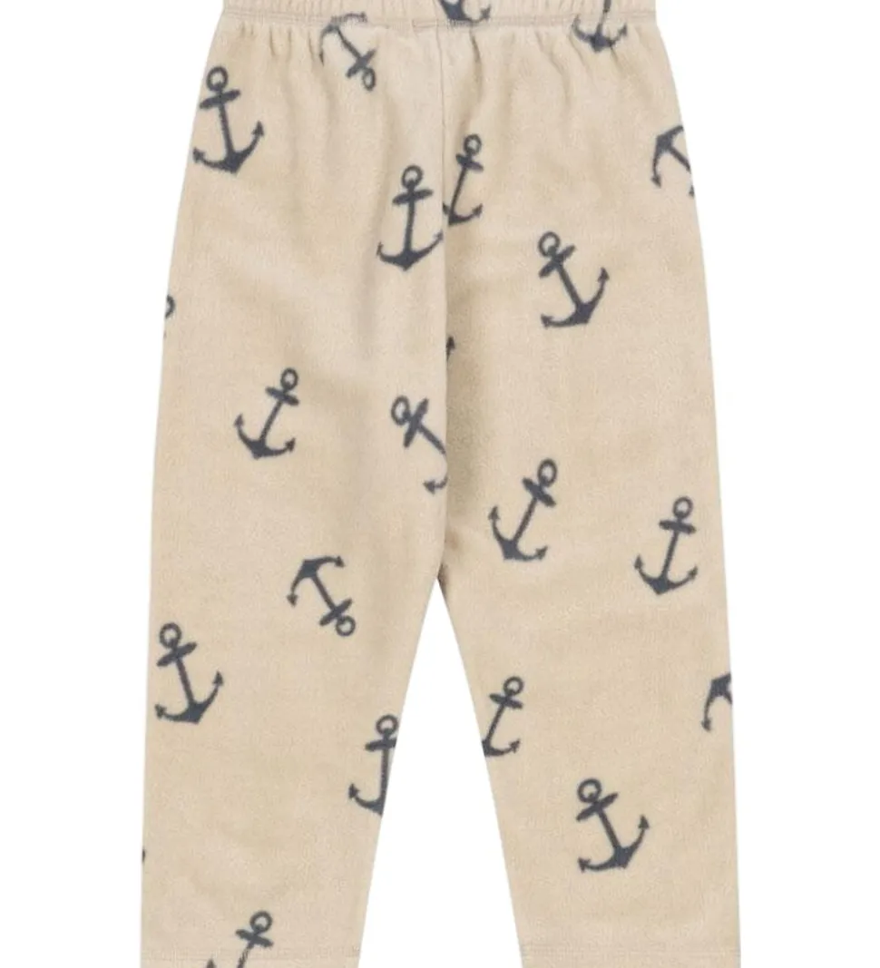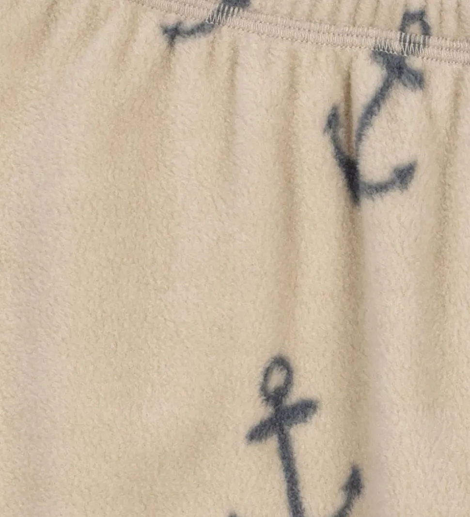 Lækre Konges Sløjd fleecebukser i beige, og med et alloverprint af ankre i mørkeblå. Konges Sløjd fleecebukserne har en bred elastikkant i livet, hvilket får bukserne til at sidde behageligt. Fleecebukserne er fremstillet i en lækker og blød kvalitet.