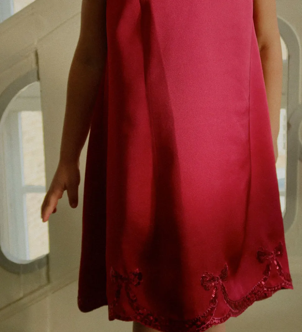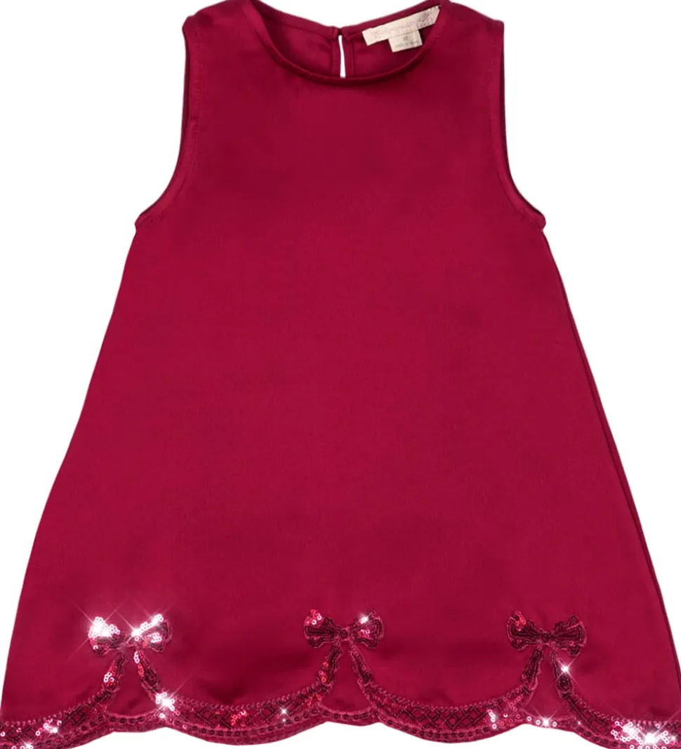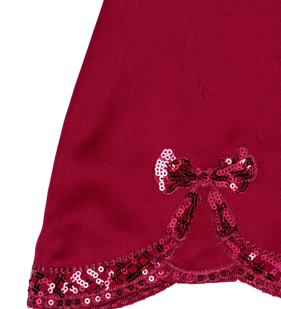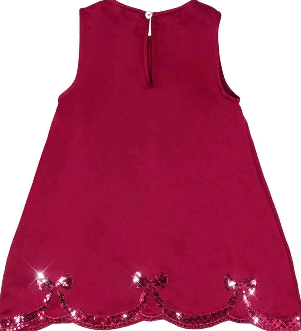 Elegant Konges Sløjd kjole i en dyb rød satin. Kjolen er uden ærmer og har et flot A-snit. Forneden er kjolen dekoreret med små sløjfer lavet af pailletter, der tilføjer et dekorativt touch. Konges Sløjd kjolen lukkes i nakken med en knap.
