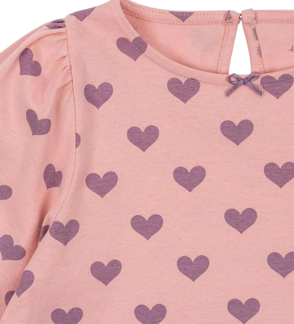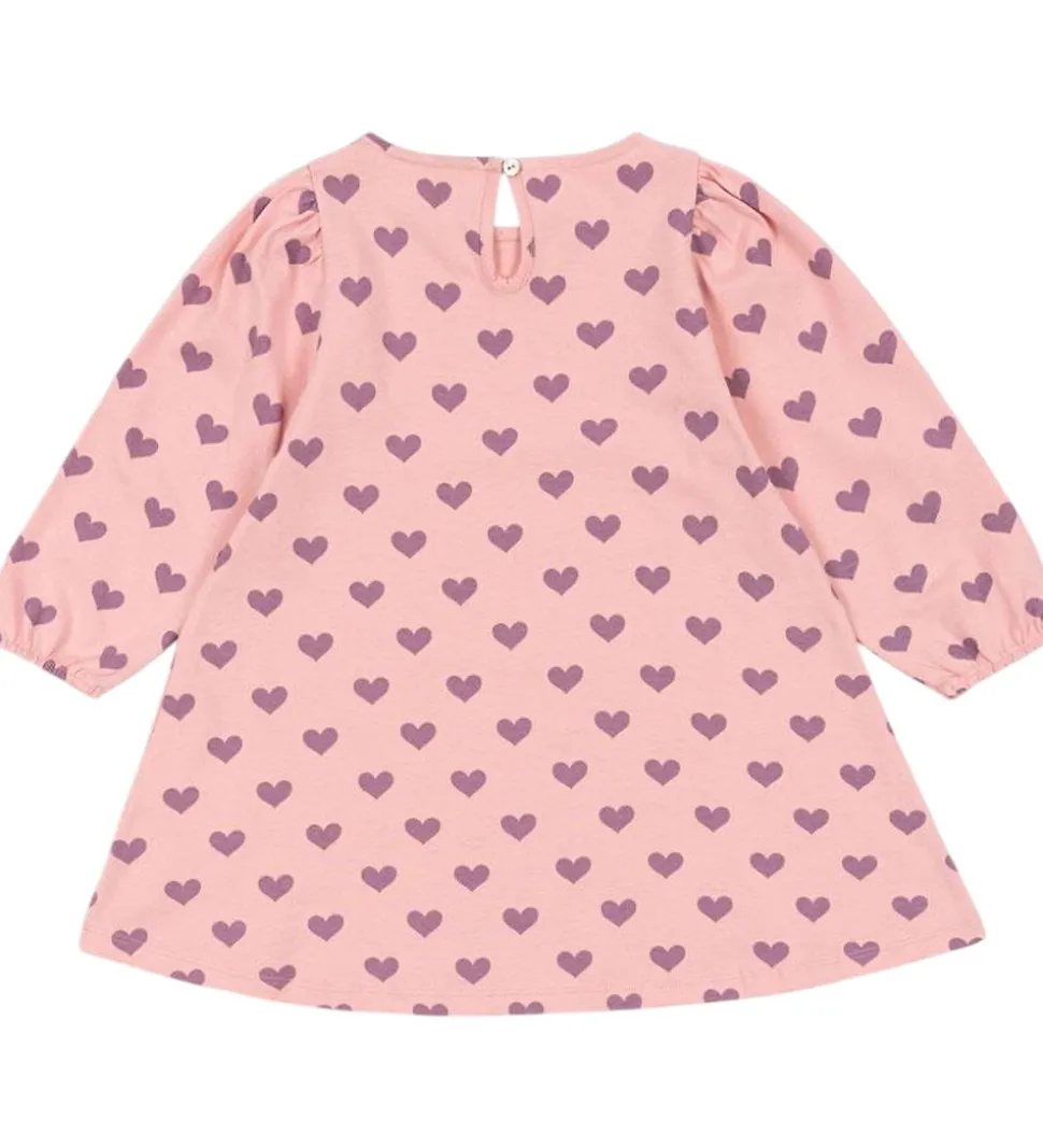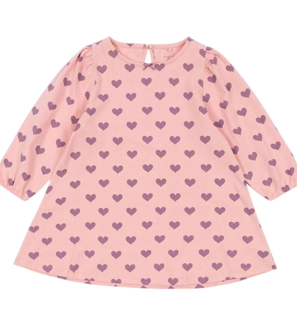 Indbydende Konges Sløjd kjole i en sart, rosa nuance dekoreret med små, lilla hjerter. Kjolen har lange ærmer med let puf og rund halsudskæring. Konges Sløjd kjolen er lavet med en blød struktur, der skaber et behageligt udtryk.