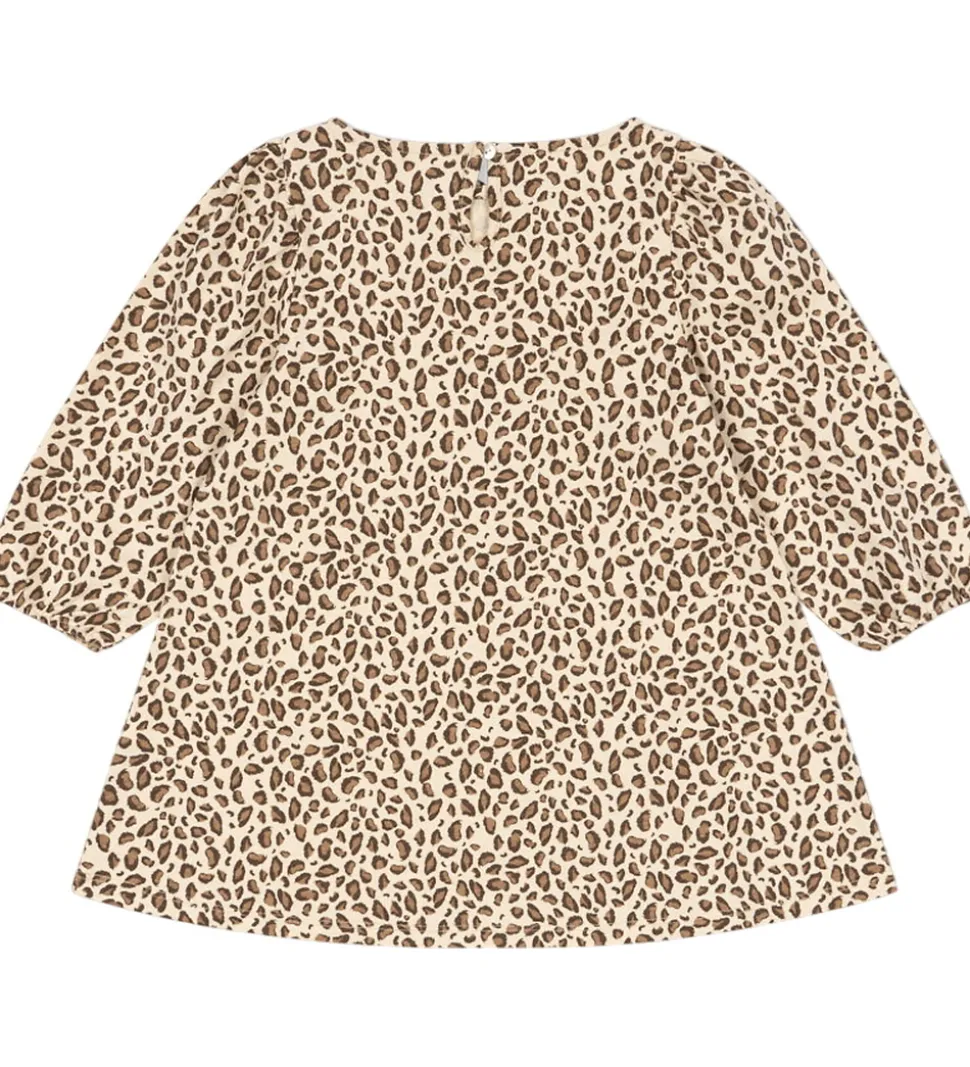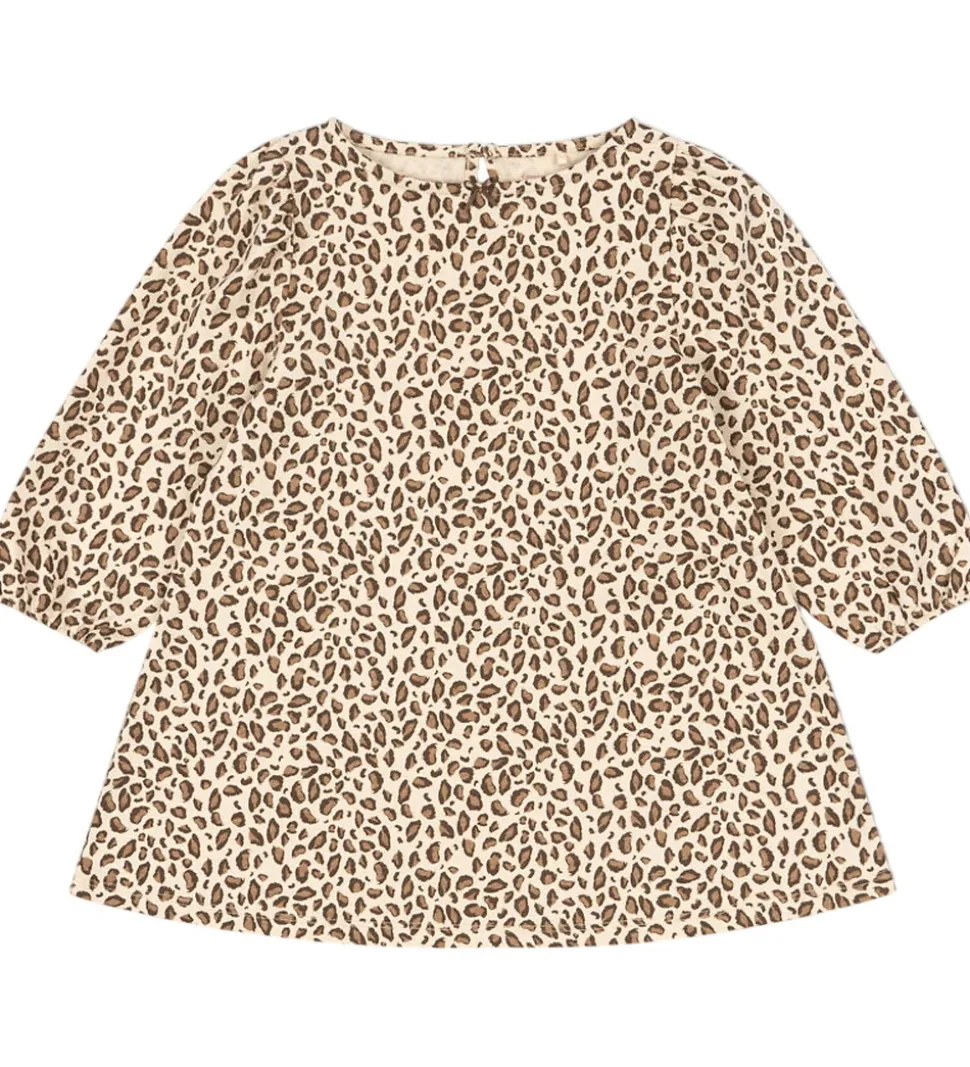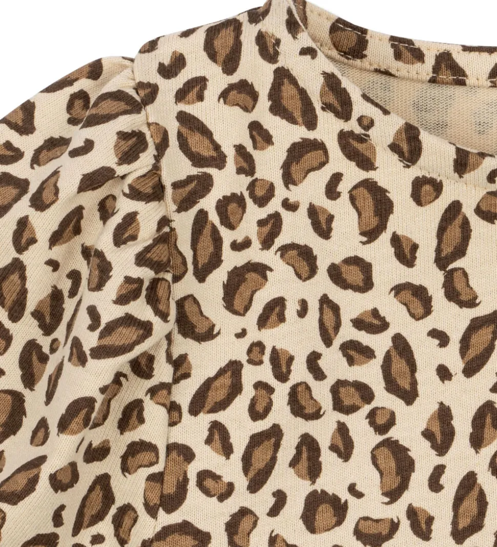 Smart Konges Sløjd kjole med et leopardmønster i brune og beige nuancer. Kjolen fra Konges Sløjd har lange ærmer og en rund halsudskæring. Stoffet falder let og har en løs pasform.