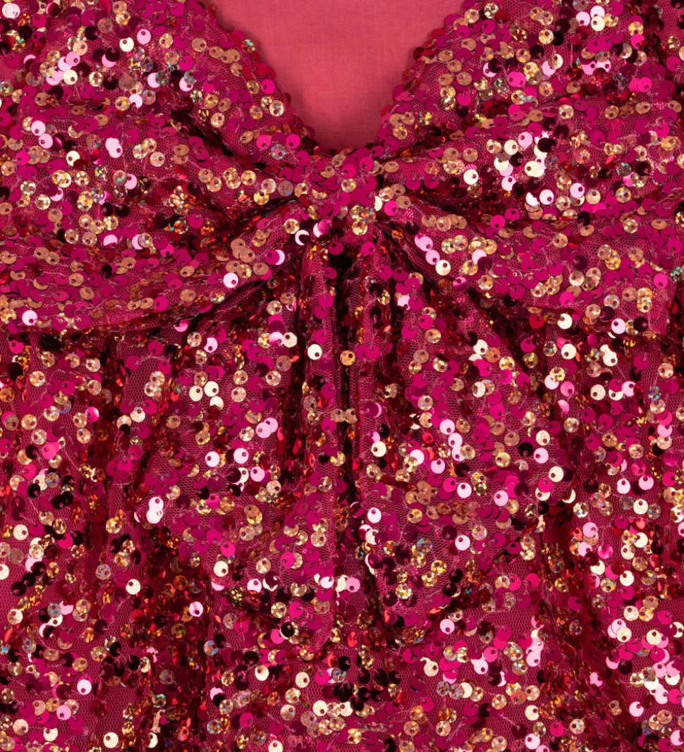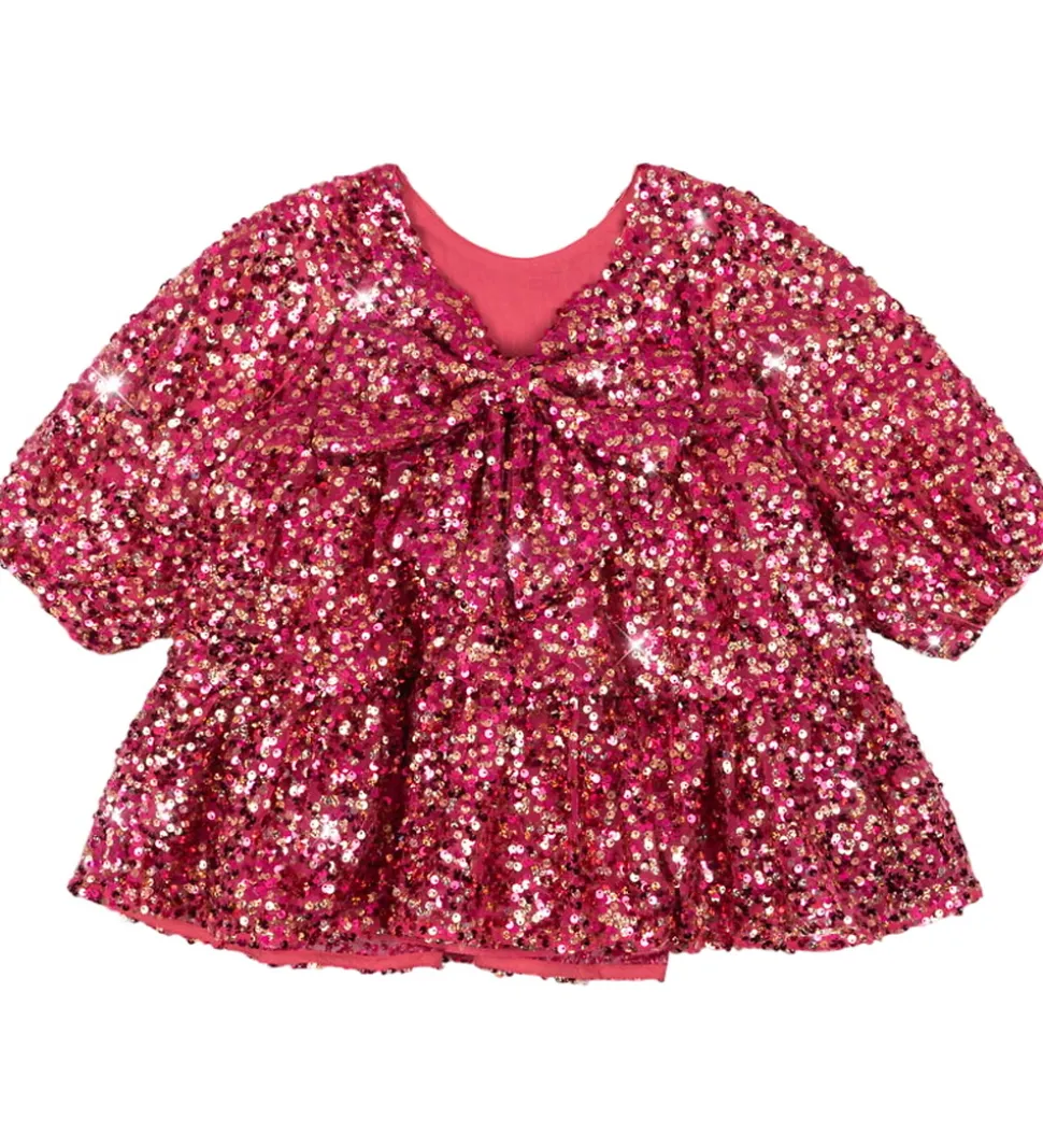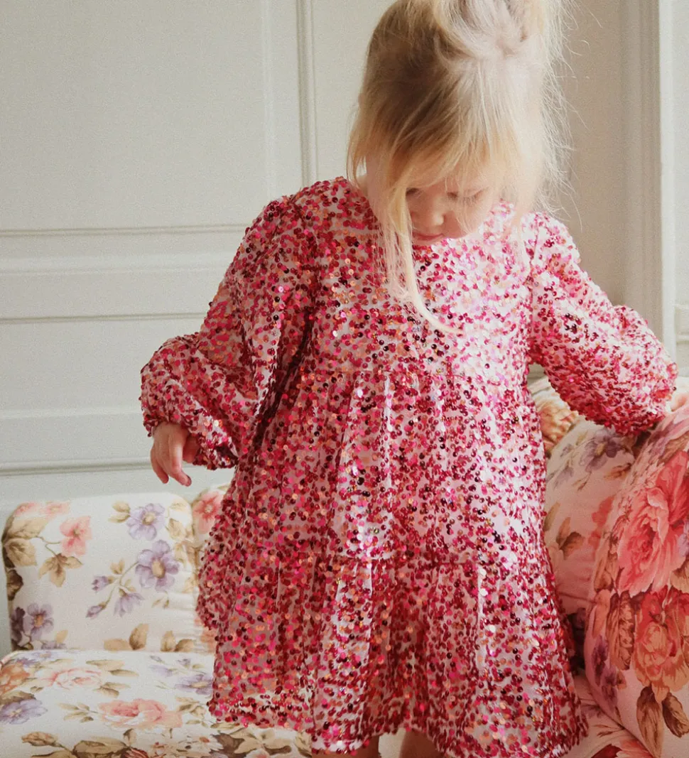 Festlig Konges Sløjd kjole prydet med skinnende, rosa pailletter. Denne Konges Sløjd kjole har lange pufærmer og en rund halsudskæring. Kjolen har en nedringet ryg med en fin sløjfeapplikation.