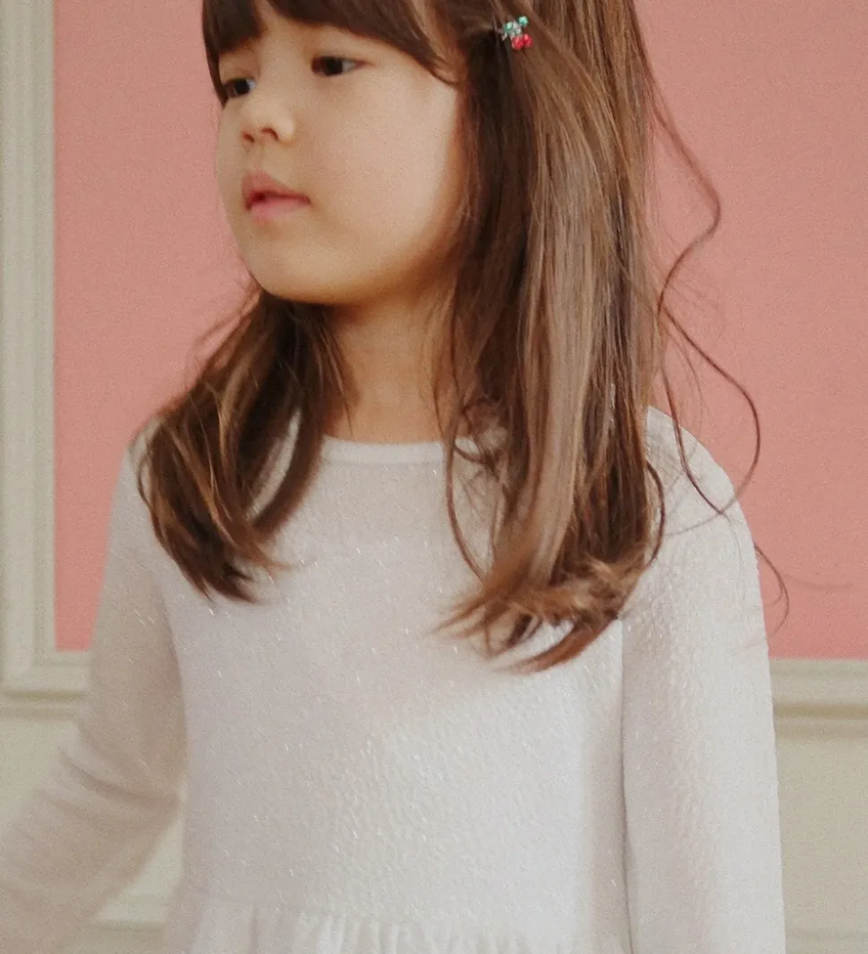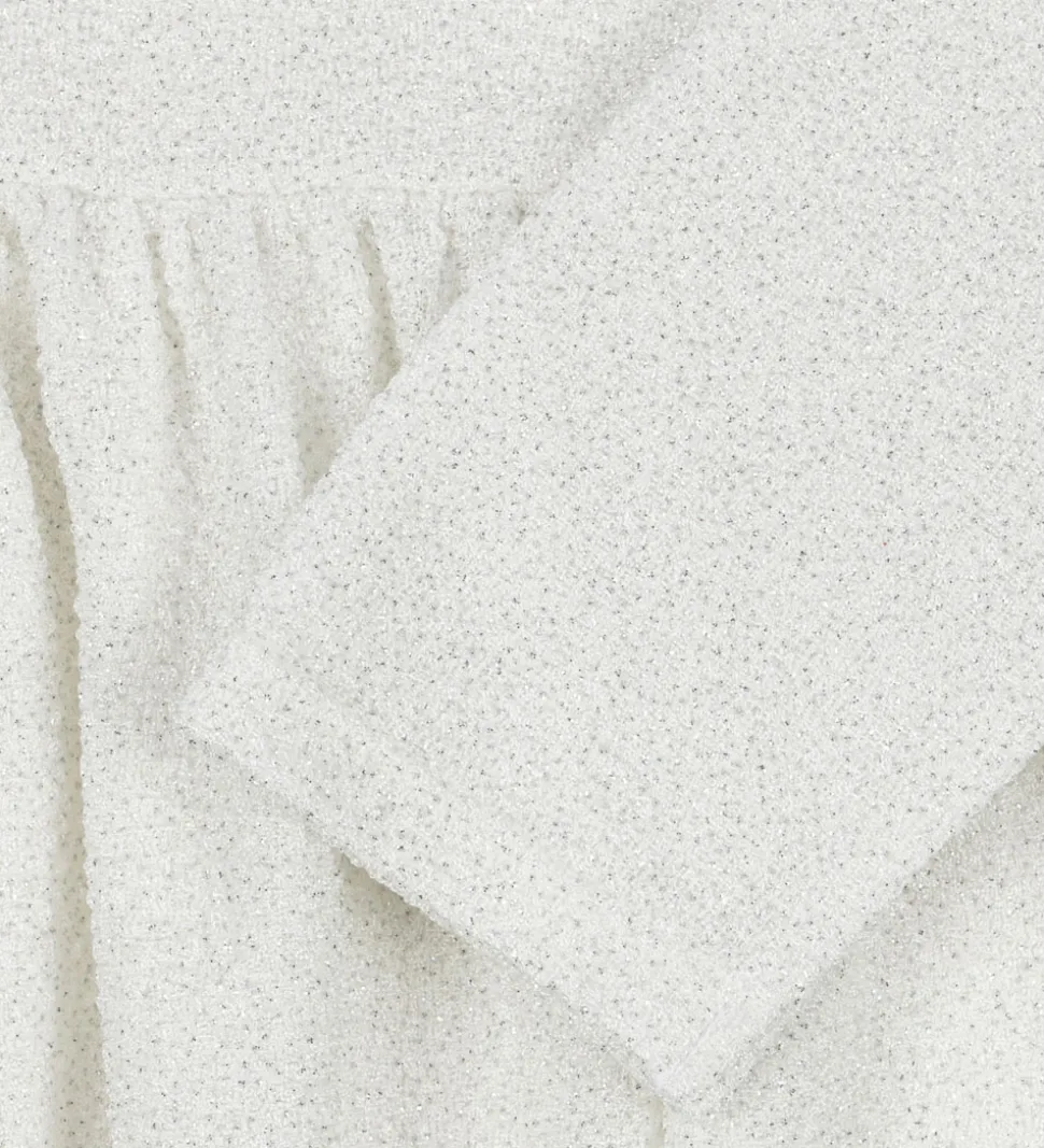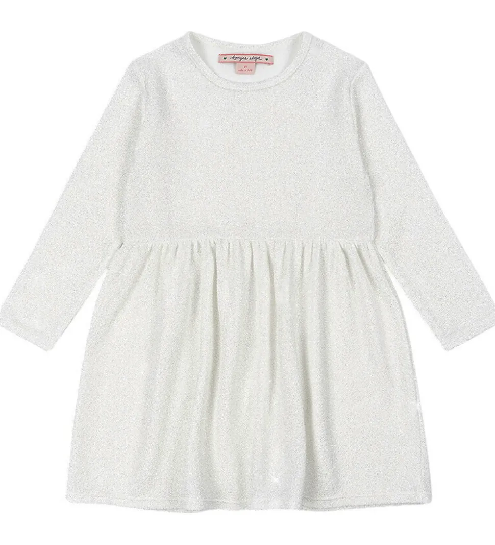 Elegant Konges Sløjd kjole i en smuk, hvid nuance med fine sølvglitter-detaljer. Konges Sløjd kjolen har lange ærmer og en rund halsudskæring. Nederdelen har en let rynket struktur, der tilføjer et diskret touch til det enkle design.