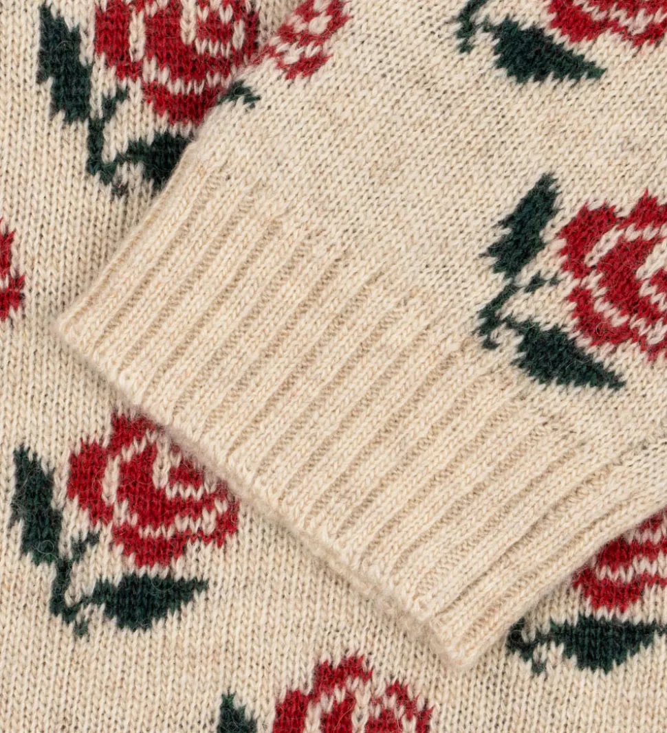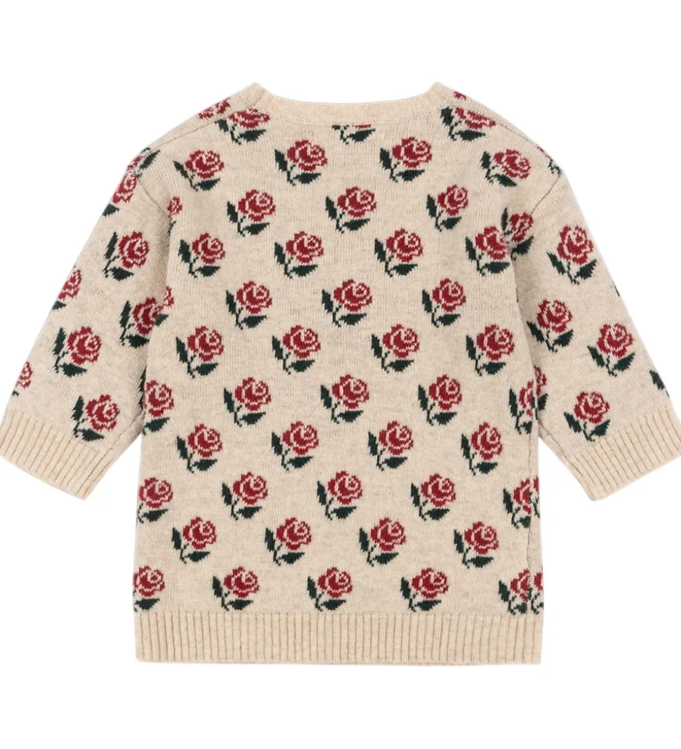 Fin Konges Sløjd kjole i beige med røde roser med grønne blade. Konges Sløjd kjolen har ribkanter ved hals og ærmer, hvilket fuldender designet. Kjolen er lavet i en strikket kvalitet i en blød og lun uldblanding.