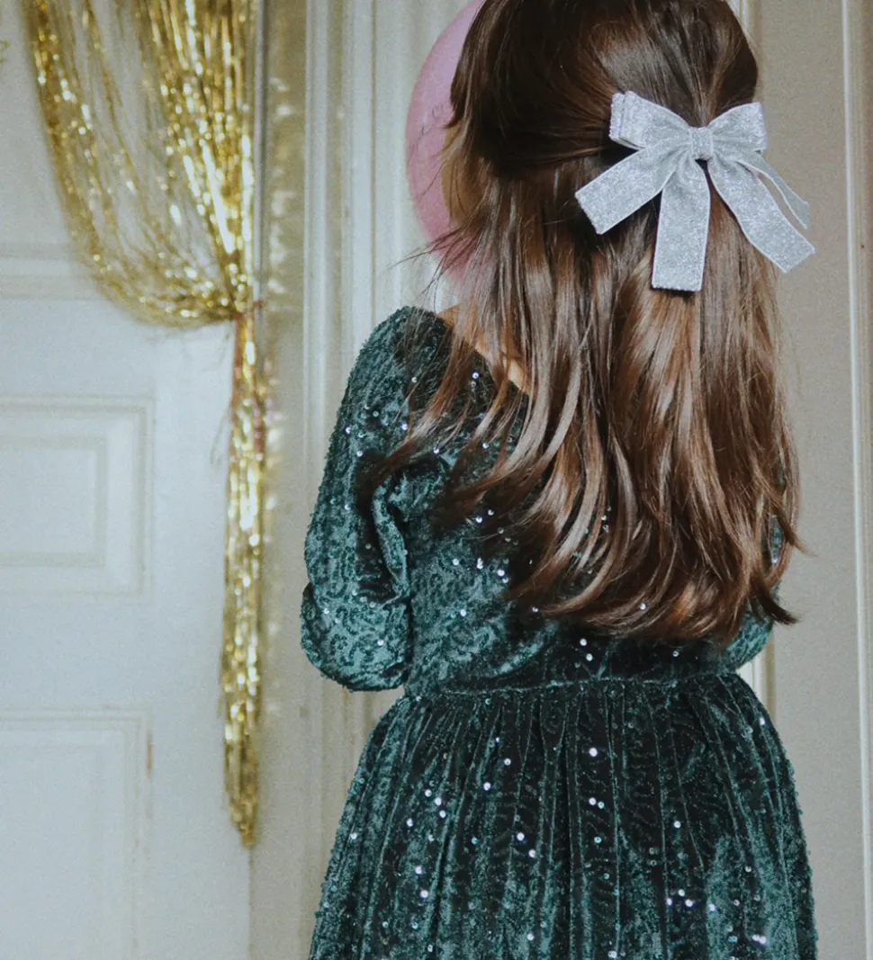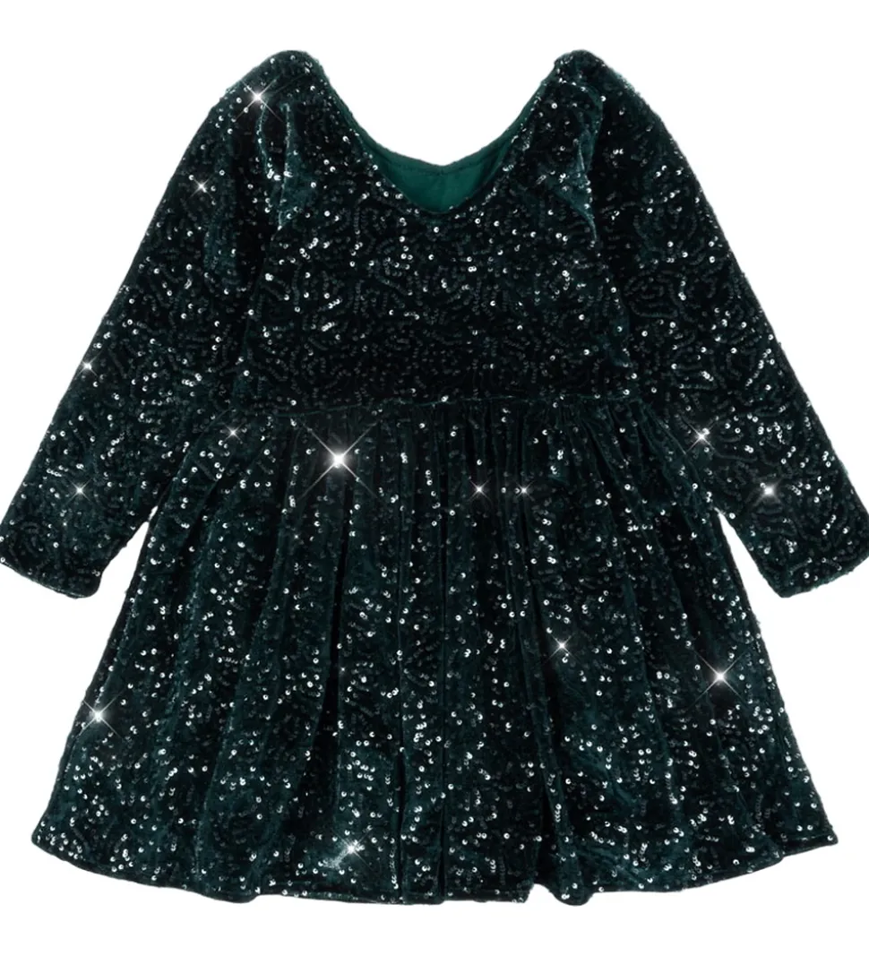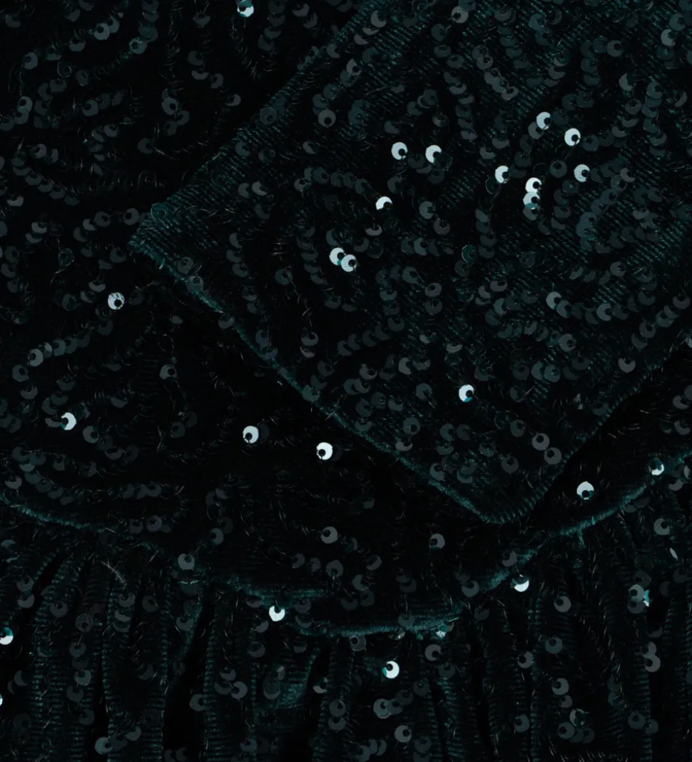 Imponerende Konges Sløjd kjole med lange ærmer. Kjolen er prydet med glitrende pailletter i en dyb, grøn nuance og har en lækker velour-struktur. Konges Sløjd kjolen har en elegant, let V-udskæring og let rynket skørt.