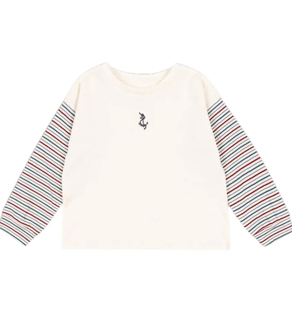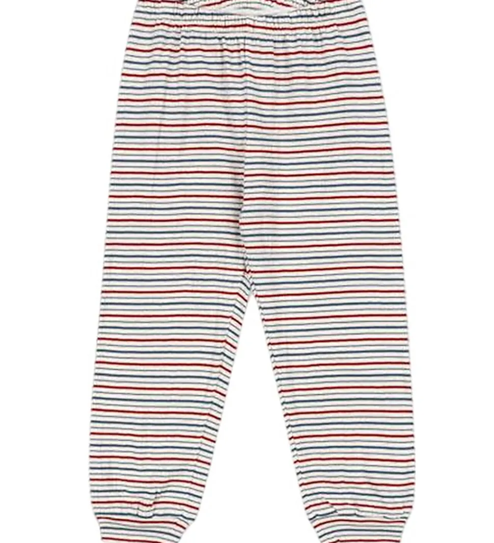 Dejligt Konges Sløjd nattøj bestående af en langærmet bluse og et bar bukser. Nattøjet er i cremehvid med fine striber i blå og rød. Konges Sløjd blusen har lange ærmer og en rund halsåbning med en smal ribkant. Bukserne har en elastikkant i livet og brede kanter i benåbningerne.