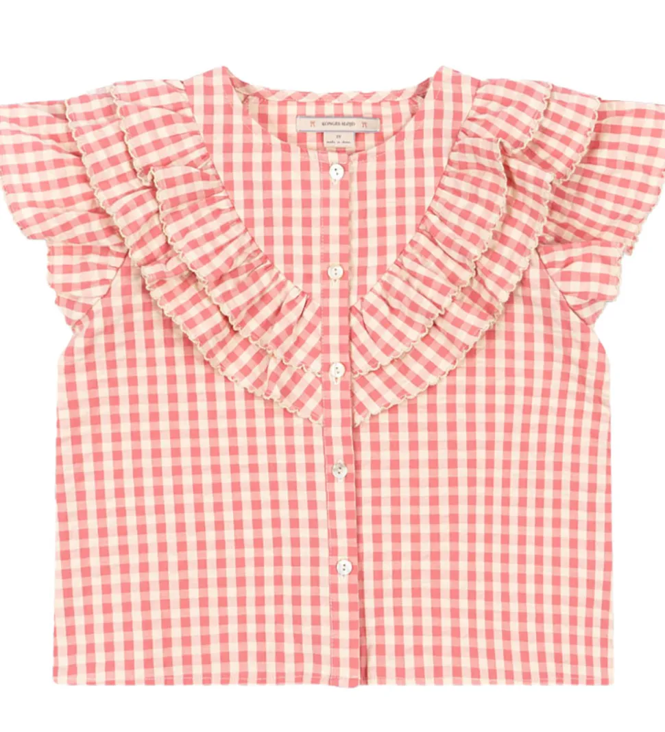 Skøn Konges Sløjd skjorte med korte ærmer i rosa og beige med ternet mønster og en dekorativ flæsekant fortil. Skjorten har gennemgående knapper fortil og er fremstillet i en let bomuldskvalitet.