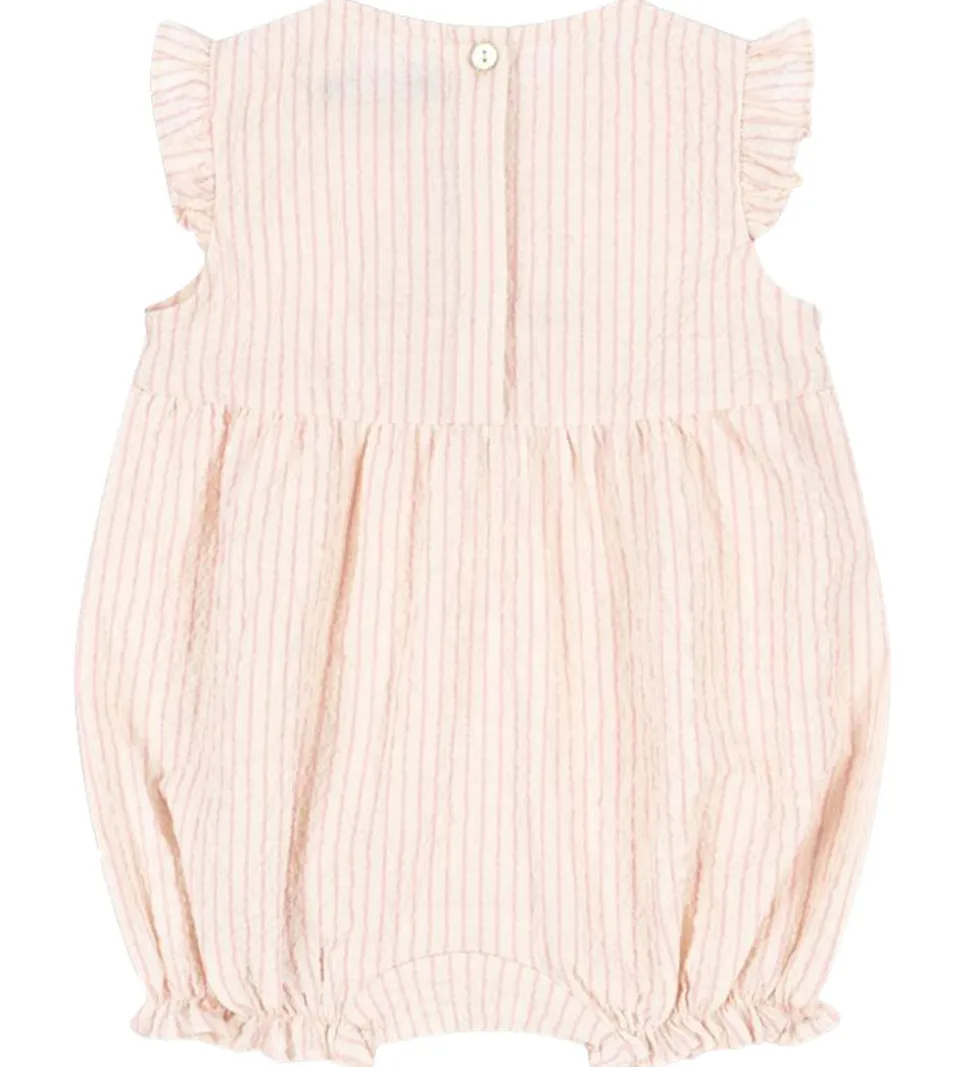 Lækker Konges Sløjd sommerdragt med korte ærmer i stribet bæk og bølge i hvid og lyserosa. Sommerdragten har et fint kirsebærbroderi på fronten og små flæser ved skulderen. Dette design er ideelt til varme dage, hvor komfort og stil går hånd i hånd.