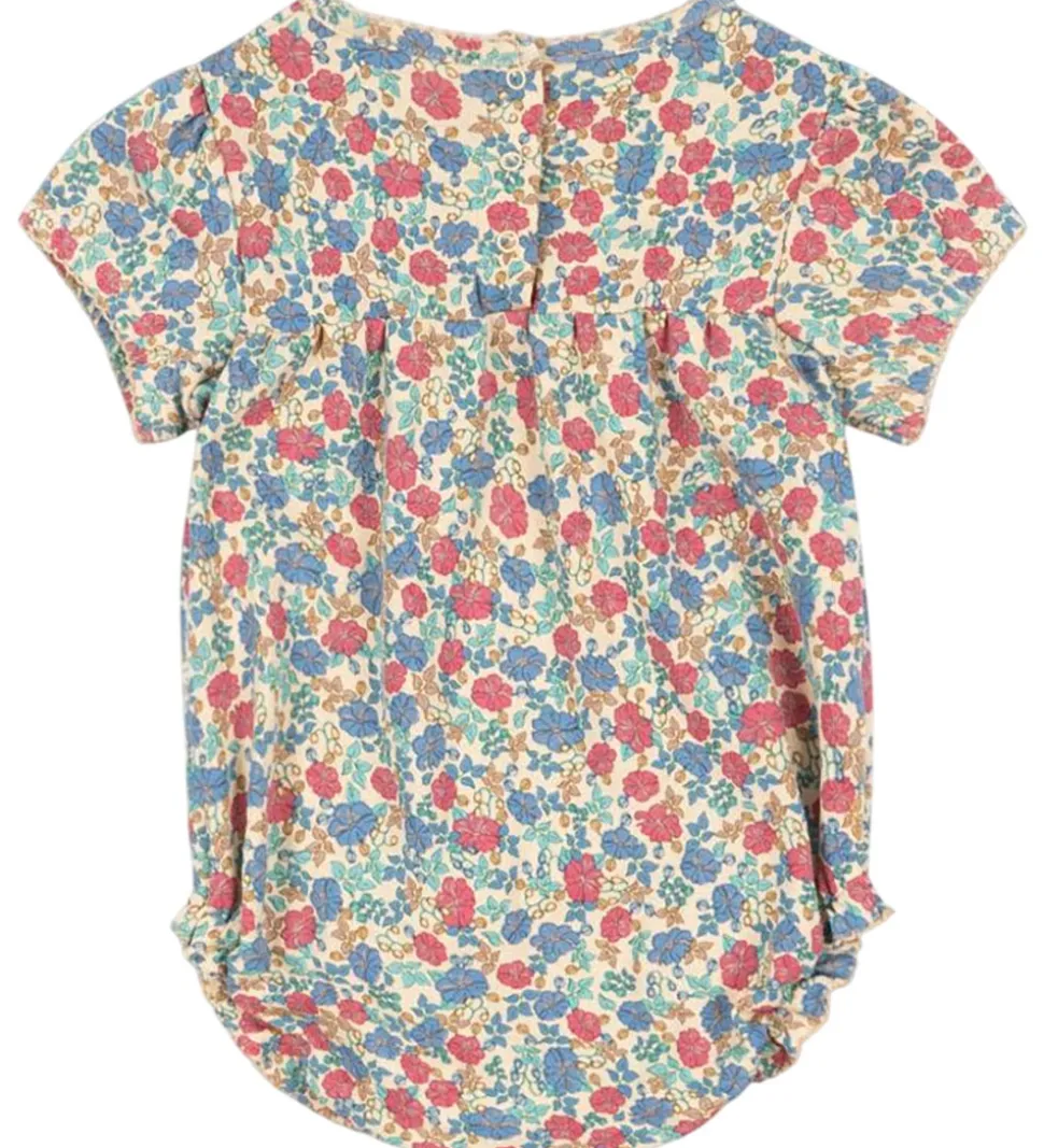 Farverig Konges Sløjd sommerdragt med et smukt blomsterprint i blå, rød og beige nuancer. Sommerdragten har korte ærmer og en rund halsudskæring, der fuldender et klassisk look. Trykknapper mellem benene gør påklædningen lettere.