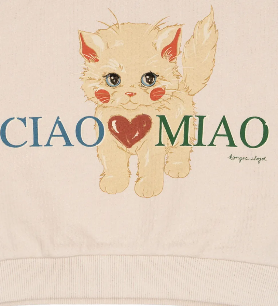 Charmerende Konges Sløjd sweatshirt i en blød, beige nuance med rosa skær. Forsiden prydes af et sødt katteprint med teksten “CIAO MIAO” i flotte kontrastfarver.